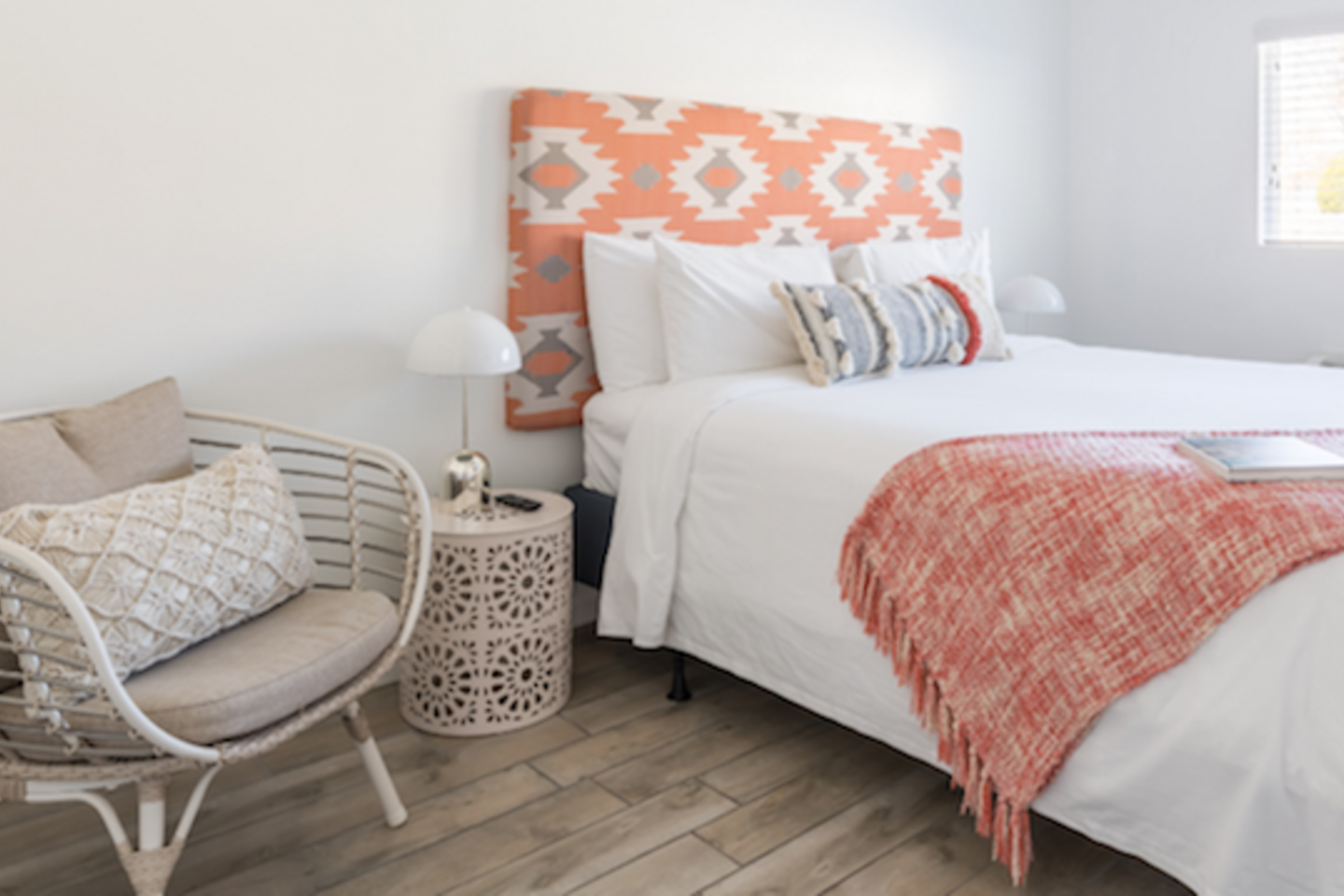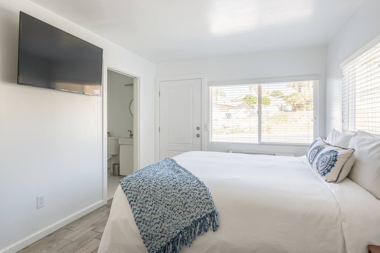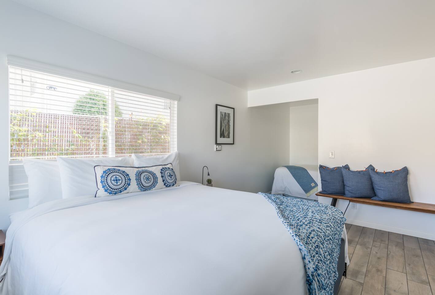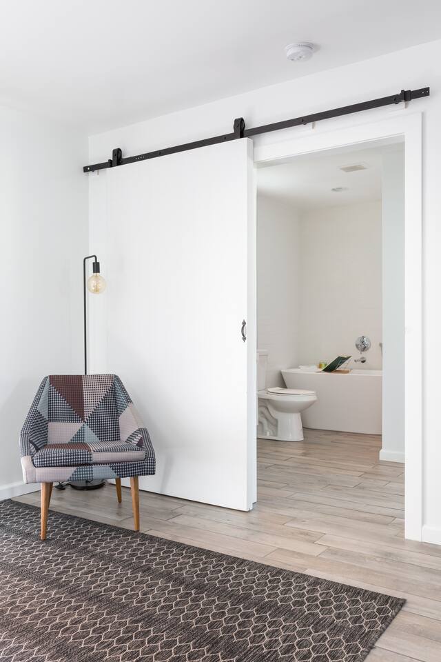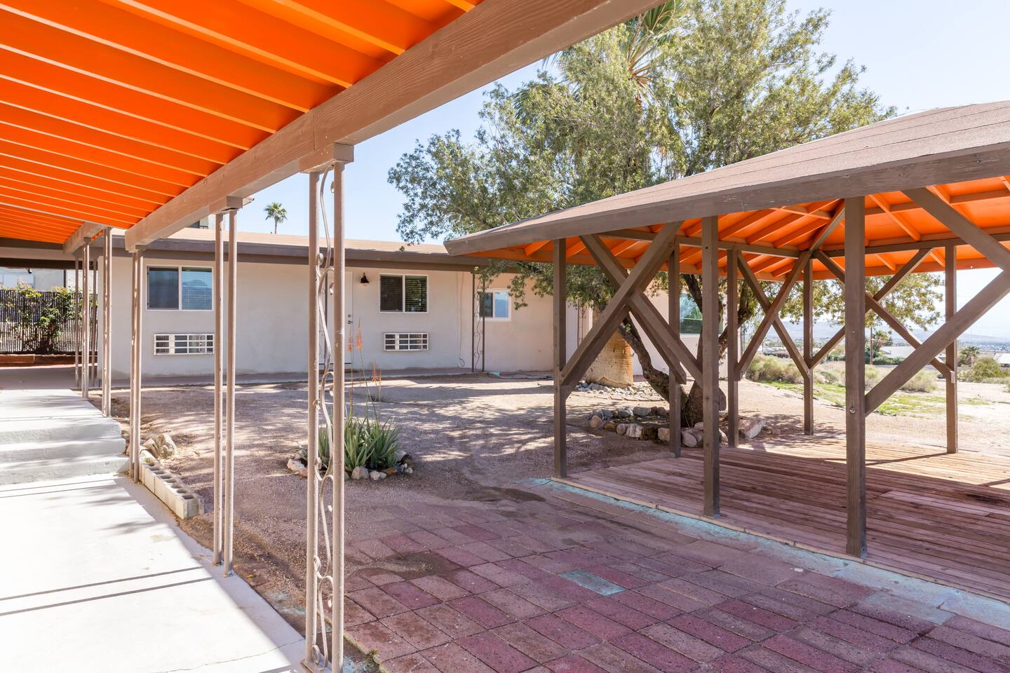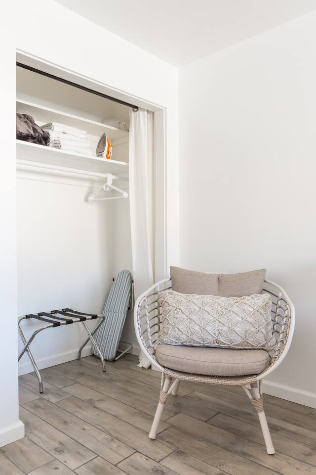 This 100%, renovated apartment with 2 bedrooms and 2 full bathrooms offers a modern, cool retreat in the desert. Perfect for those wishing to visit the beautiful desert locale but still remain close to local conveniences, such as grocery stores, drug stores, and restaurants. Great for families or groups of 6 or less! Hotel level amenities. Our space is professionally cleaned by hotel-trained housekeepers and features 100% cotton hotel quality linens, freshly laundered for a good night’s sleep! A beautiful view of the San Jacinto mountains can seen from the front of the unit. Master bedroom features one CA king sized bed and ensuite(attached) bathroom with soaking tub. The second bedroom also features a CA king-sized bed and includes an extended nook that contains a queen-sized bed. Second bedroom also includes attached, private bathroom. Each bedroom features a 50” flatscreen smart TV for streaming using your accounts. --Amenties-- -A fully furnished kitchen is at your disposal with stainless steel full size appliances. It is well stocked with dishes, cookware, and basic cooking essentials such as salt, pepper, spice rack, and coffee. -Bathroom includes a soaking tub. Bathroom amenities includes hotel towels, shampoo, soap. -Ironing board + Iron -Hotel quality 100% cotton linens -Free Parking for one vehicle in the driveway, with plenty of easy street parking. ***PLEASE GO OVER FULL LISTING DESCRIPTION AND OTHER THINGS TO NOTE SECTION PRIOR TO BOOKING.***