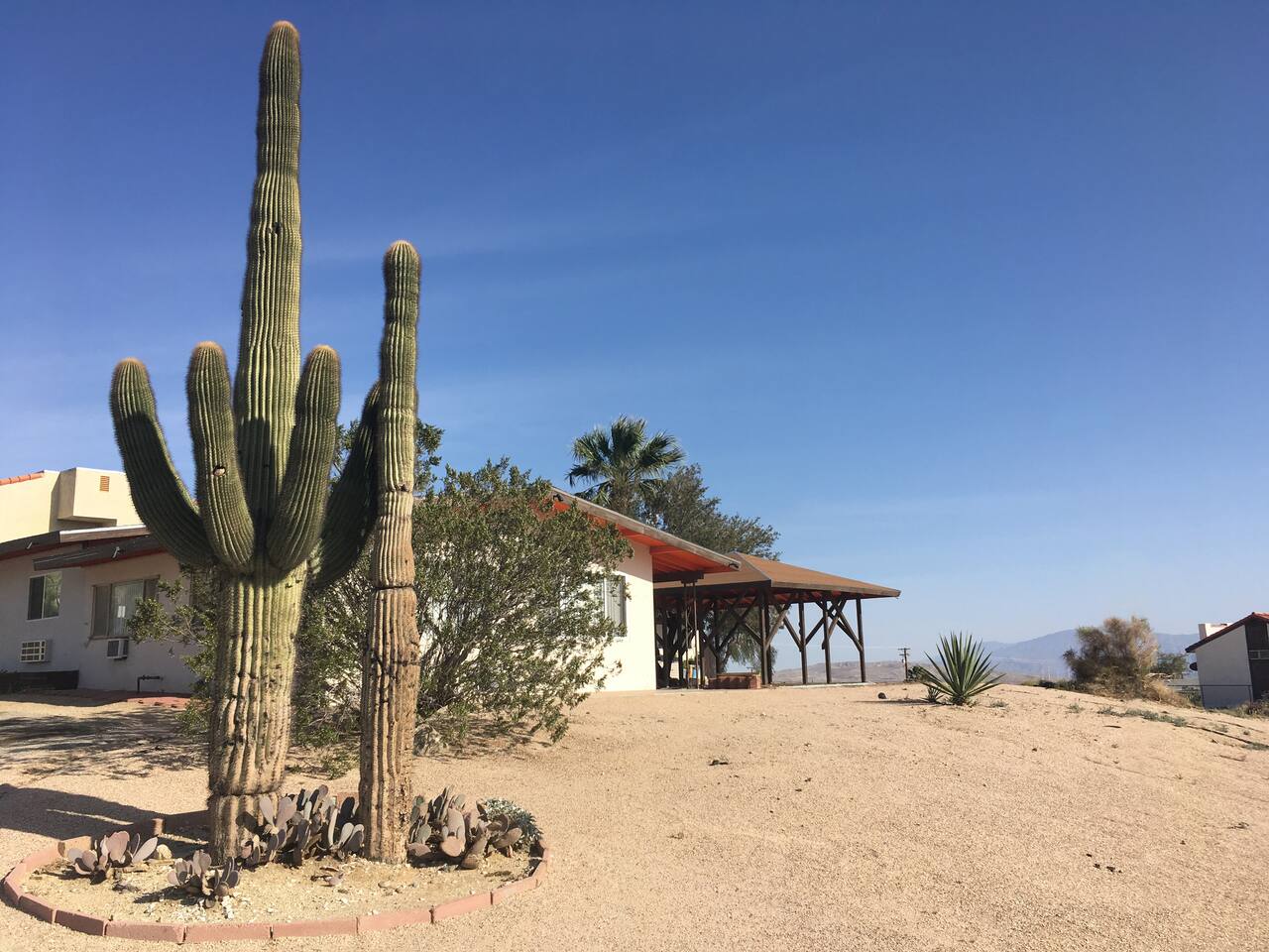Located in Desert Hot Springs, the apartment is set on slightly raised land boasting panoramic vistas of the San Jacinto Mountains. Grocery stores, restaurants, and stores are a short drive away. The entrance to Joshua Tree is 45 minutes away by car. Although not as fancy as its neighboring Palm Springs, it is visited by hundreds of tourist daily for its renowned abundance of natural mineral spring water.