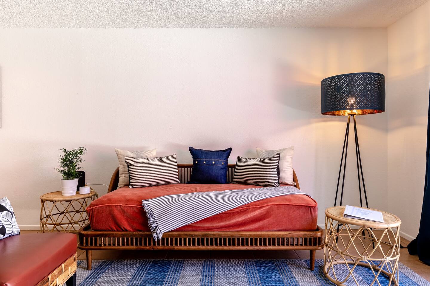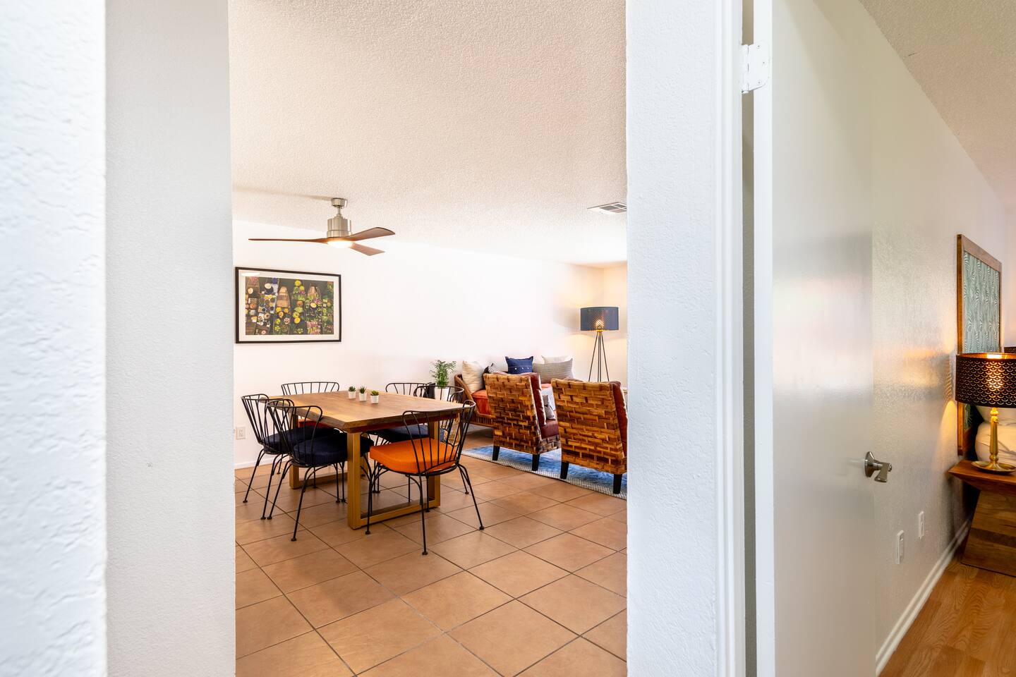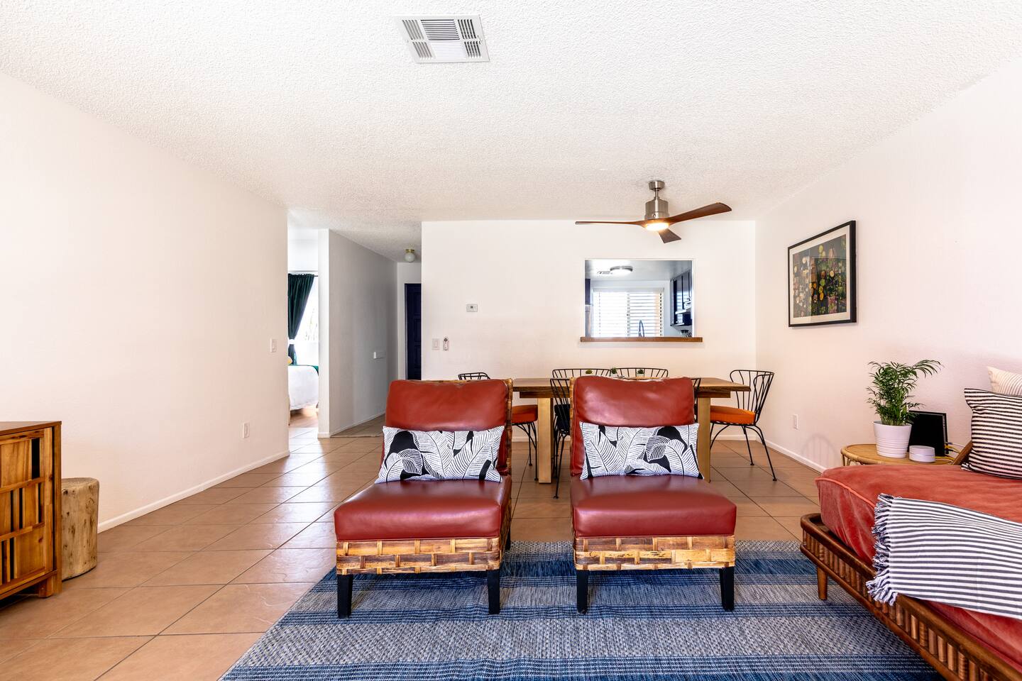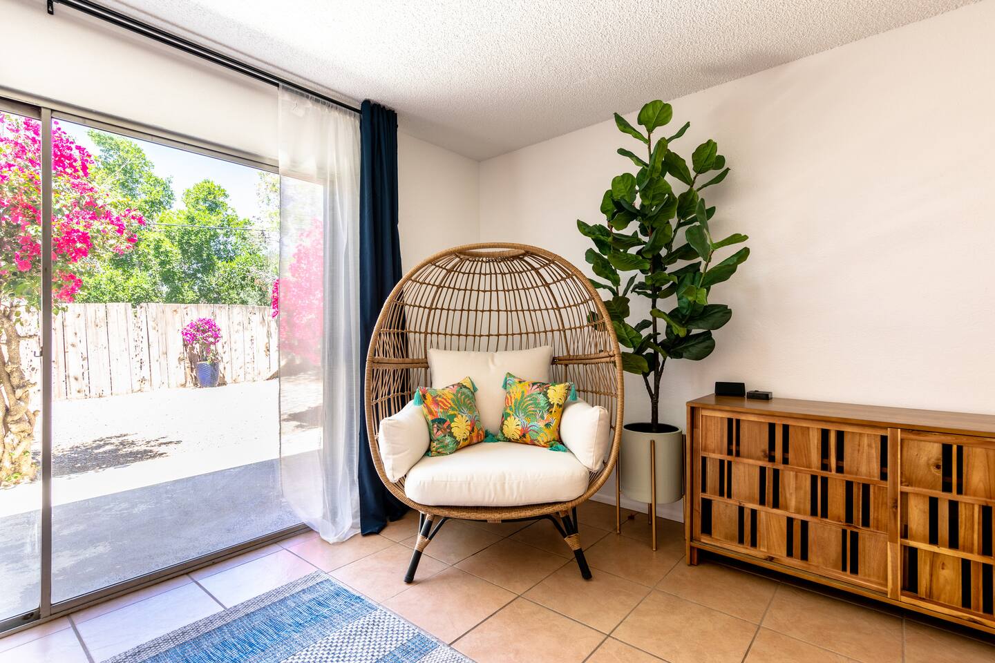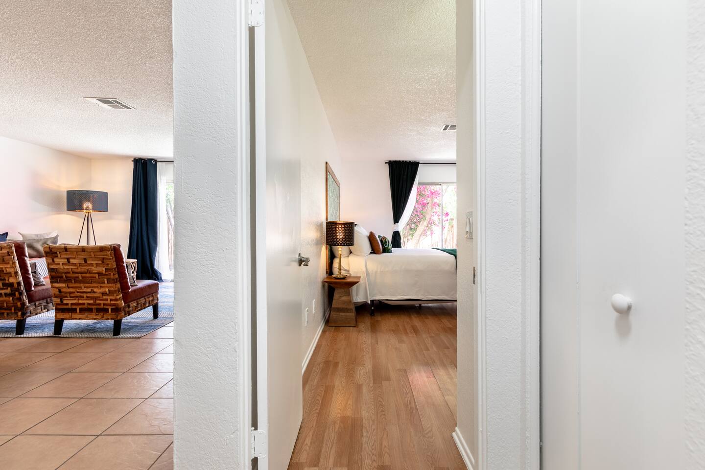 Our apartment sits on a private cul-de-sac offering views of San Jacinto Mountains. The private back yard allows you to enjoy the clear skies and desert weather. Our place is well-appointed with amenities such as a Smart TV in living room, WIFI, and fully equipped kitchen with full size appliances and everything you need to make a home-cooked meal! Two bedrooms each with a King size bed. Two full bathrooms. Living room has a day bed with Twin size mattress. Central air/heating. Plenty of street parking available along the curb. Our space is professionally cleaned by hotel-trained housekeepers and features quality linens, freshly laundered for a good night’s sleep! --Amenities-- -A fully furnished kitchen is at your disposal with brand stainless-steel full-size appliances. It is well stocked with dishes, cookware, and basic cooking essentials such as oil, salt, pepper, spice rack, and coffee + tea. -Bathroom includes hotel-quality towels, hair dryer, shampoo, soap. -Ironing board + Iron -Hotel quality linens --Pet Policy-- We allow up to 2 dogs per unit. Upon departure, clean up dog hair to the best of your ability. The cost of additional cleaning or laundering services due to excessive dog hair will be billed to the guest. Vacuum is provided in unit. Promptly bag and dispose of all dog waste from the yard during your stay and at time of departure. We request all dogs be up to date on vaccinations as required by state law. Dogs are not allowed on furniture or beds. Bring your dog’s favorite blanket or bed. Bring a pet crate and use whenever you must leave your dog unattended for a period of time. Never leave your dog unattended if it barks or chews when left alone. Do not allow your dog to disrupt the peace and serenity of the community. Dogs with any history of having bitten anyone or another animal are not allowed. ***PLEASE GO OVER FULL LISTING DESCRIPTION AND OTHER THINGS TO NOTE SECTION PRIOR TO BOOKING. ***