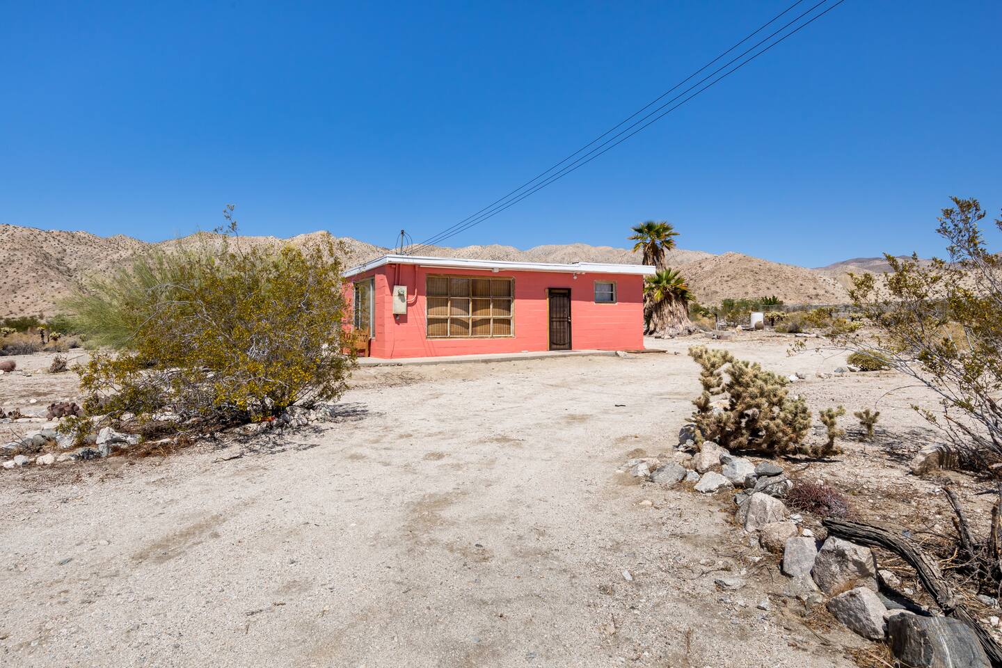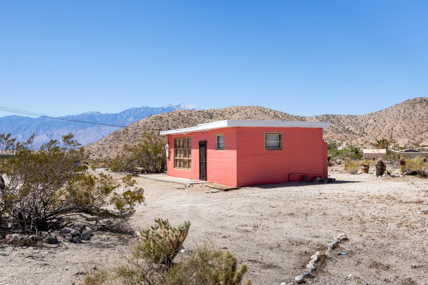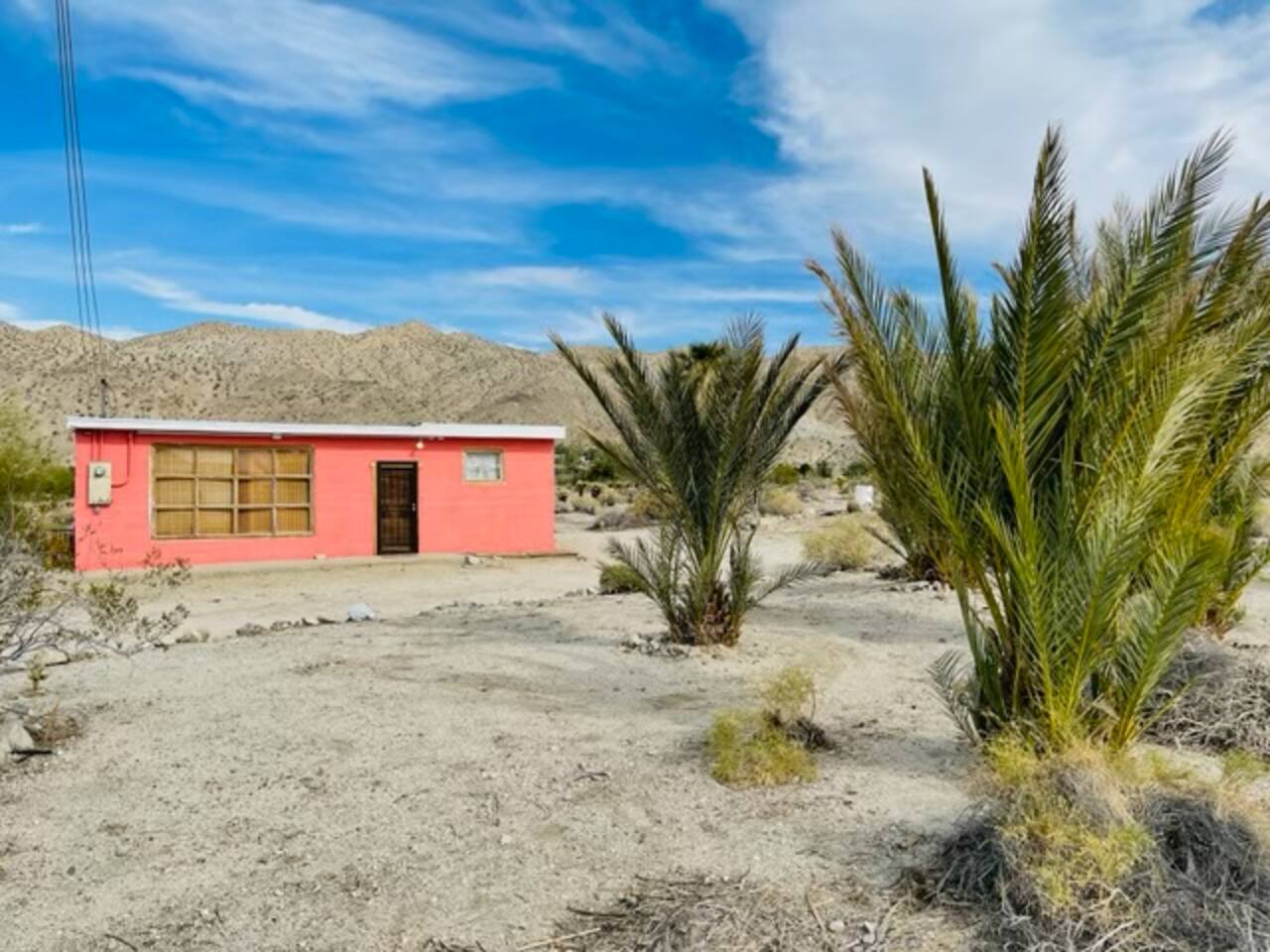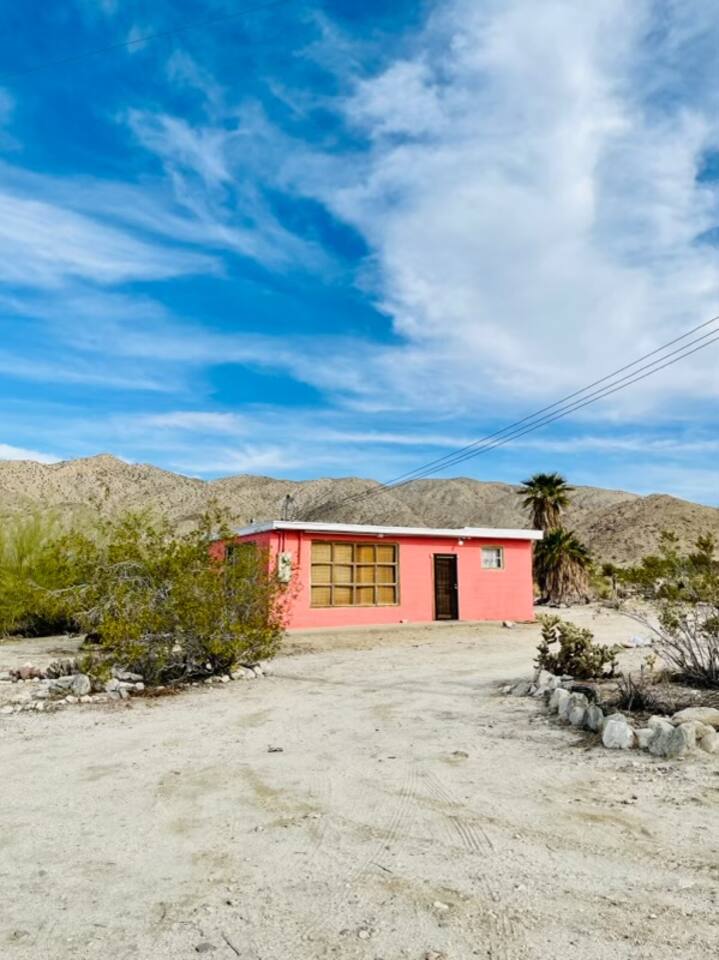 The cabin is located at the beautiful Sky Valley area outside of Desert Hot Springs. It's a rural desert area, no streetlights, so we advise you to come early to be able to spot the pink cabin. There is one small gas station 1/2 mile down the road. All grocery stores and located in town so that is a 6-7 mile drive.