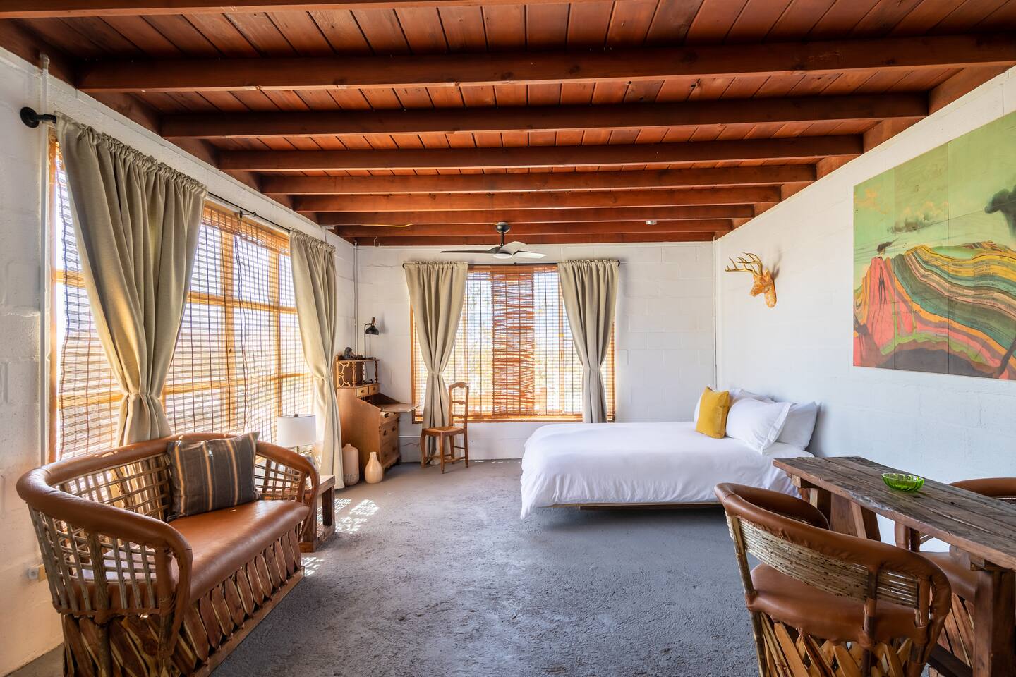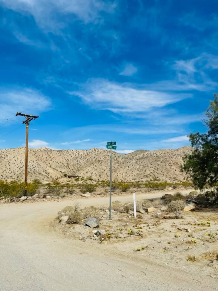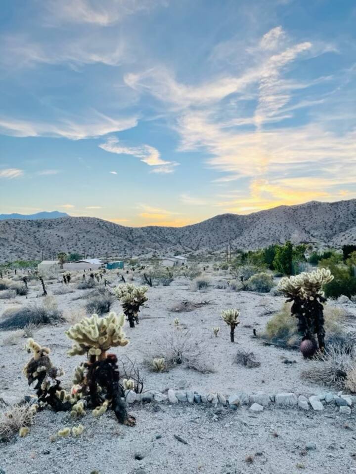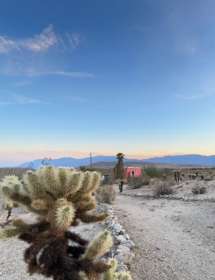 Step back in time in this unique and secluded getaway. Our cabin is located just outside of town in an unincorporated area of Desert Hot Springs, also known as Sky Valley. Enjoy breathtaking sunsets, peace and serenity. Escape from noise of the city without giving up comfort. Perfect for writers, photographers, and those trying to experience the stillness of the desert nights. Good place to stargaze. It is a rustic glamping experience.