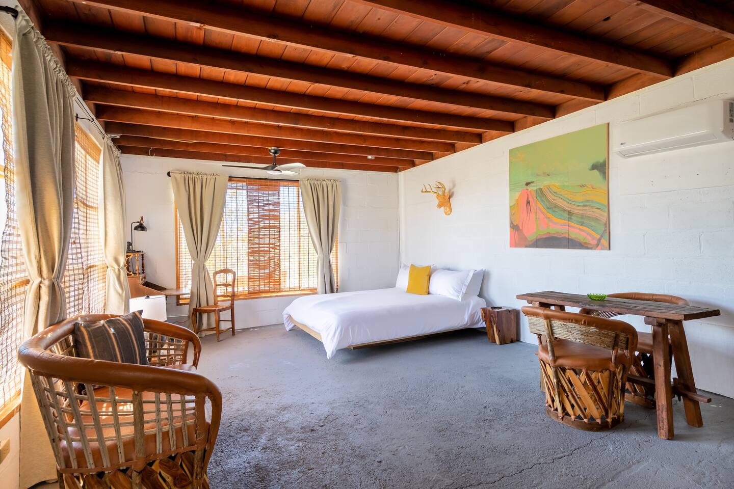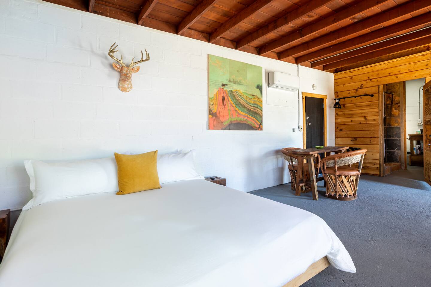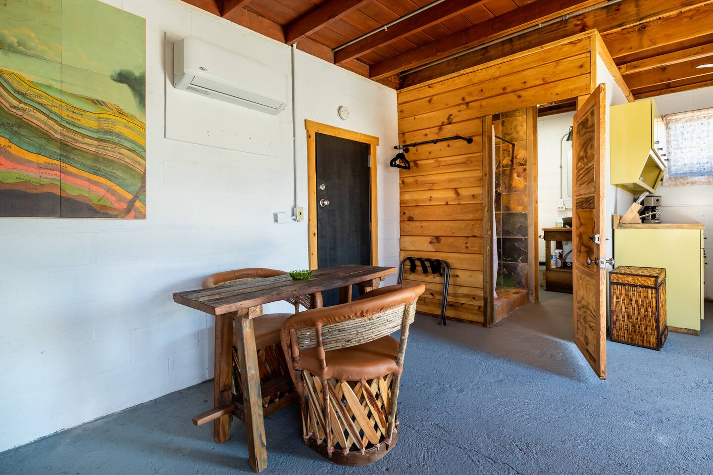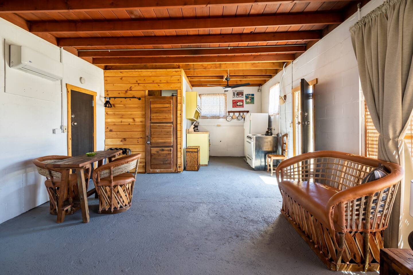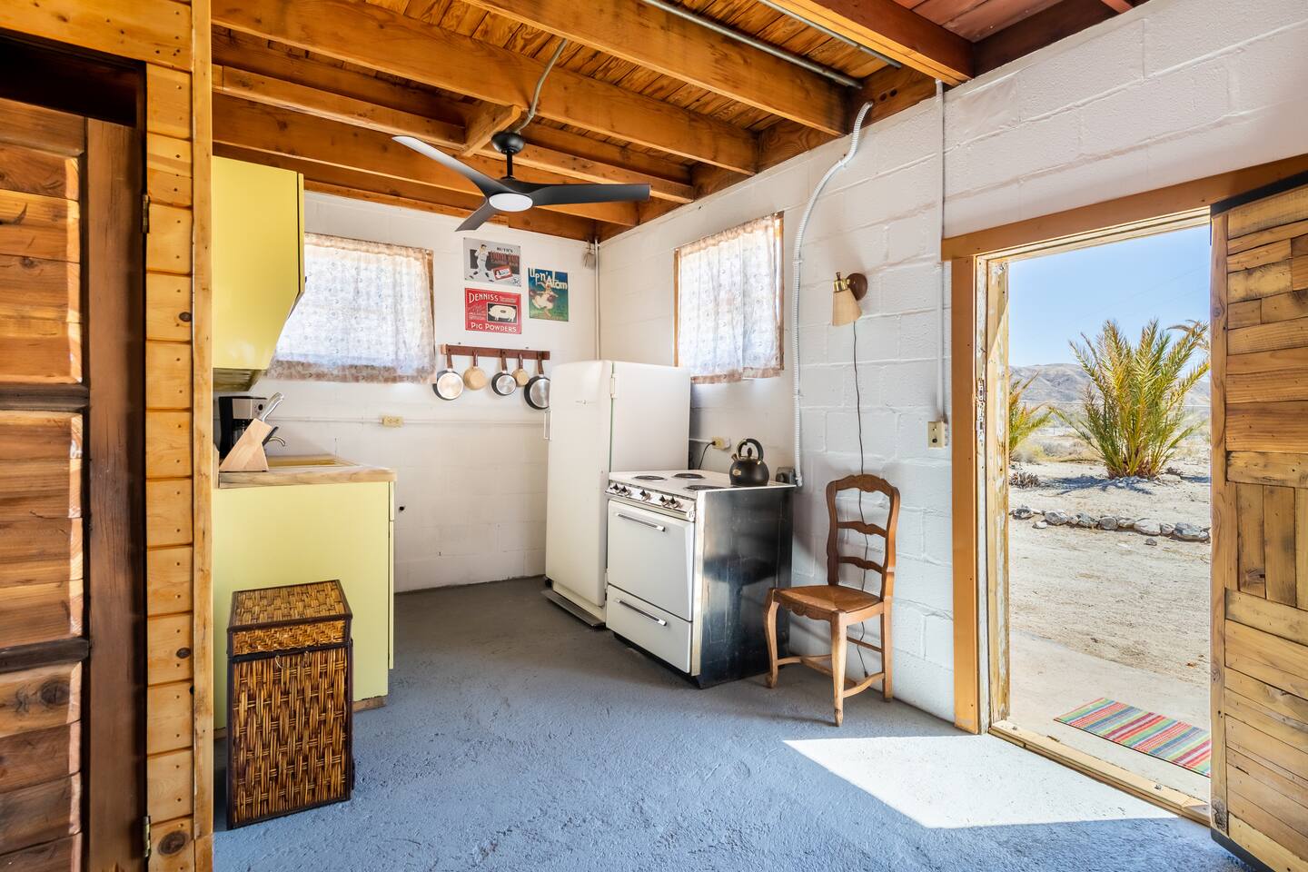 Rustic cabin in the middle of the desert. For those who enjoy camping and the outdoors. Dark desert nights can be very cold, windy and loud. We have restored the cabin to make it comfortable for our guests without compromising its uniqueness and history. The cabin is located in a remote area, you will have to drive through a patch a bumpy dirt road, the floors are slanted, windows rattle with wind, and due to the uneven floors sometimes a trickle of water can run down the floor from shower. You can't leave the door open at all because it's in the middle of nowhere and bugs are attracted to the light. As long as you understand this and can appreciate the experience then It's the perfect place to unwind, be one with nature, and enjoy tranquil desert nights. Don't get me wrong, we make sure the home is comfortable and very clean; with a large king bed, high quality linen, mini split air conditioning and heating, full functioning kitchen, hot water, and of course satellite internet. We love our cabin and want our guests to enjoy it too. There are some neighboring homes, It’s pitch black so arrive early. --Pet Policy-- We allow up to 1 dog in unit. Upon departure, clean up dog hair to the best of your ability. The cost of additional cleaning or laundering services due to excessive dog hair will be billed to the guest. Promptly bag and dispose of all dog waste from the yard during your stay and at time of departure. We request all dogs be up to date on vaccinations as required by state law. Dogs are not allowed on furniture or beds. Bring your dog’s favorite blanket or bed. Bring a pet crate and use whenever you must leave your dog unattended for a period of time. Never leave your dog unattended if it barks or chews when left alone.