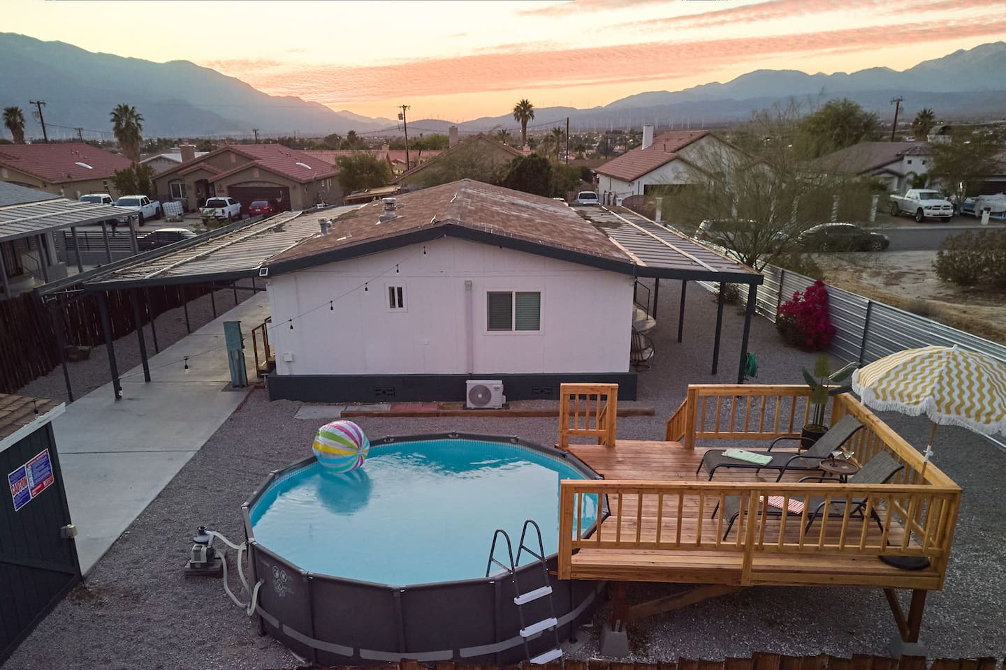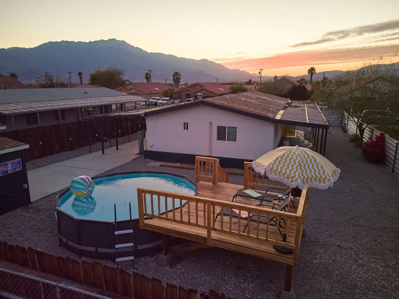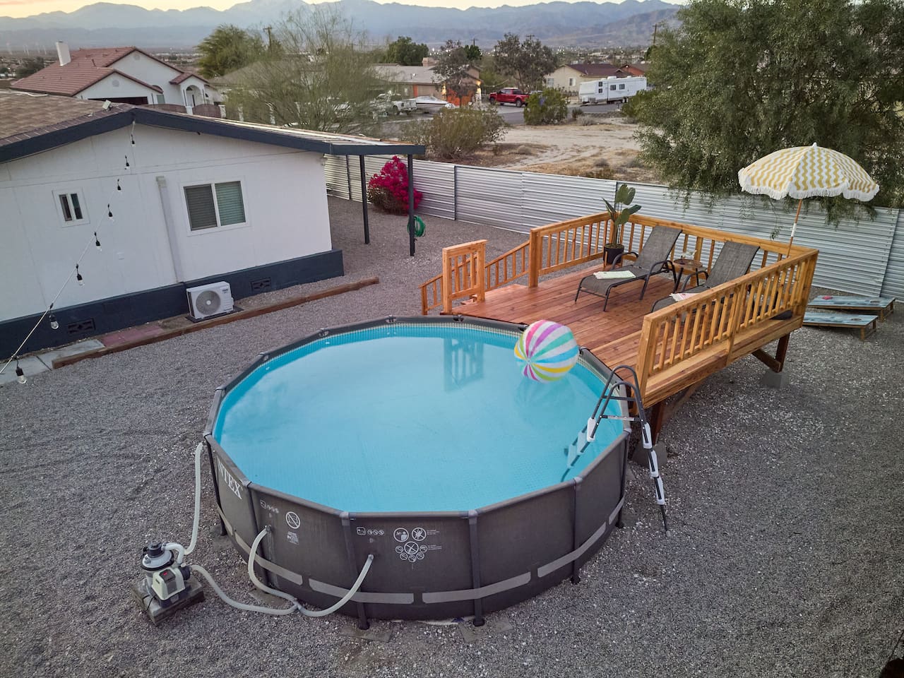 County of Riverside STR Permit RVC-1637 Nestled in the middle of a residential neighborhood of Desert Hot Springs w/ spacious open floor plan & fully fenced w/covered carport. To help beat the heat in the summers we have an Intex above ground pool our guests can use. Our two bedroom home sleeps 5 people comfortably. Due to high demand on special event weekends we do allow up to 7 guests with extra fee. We strongly recommend that you bring your airmattress. pillows, and blankets.