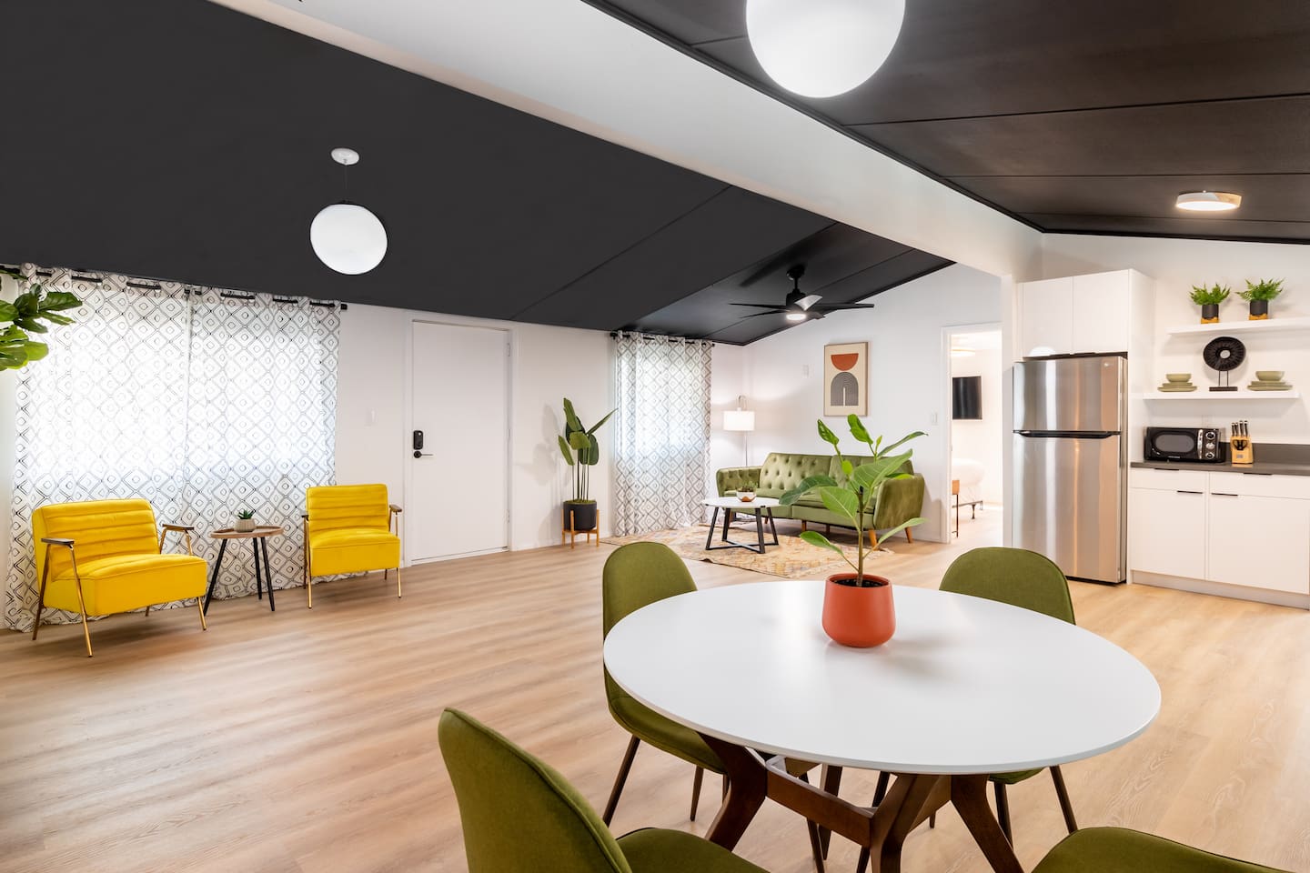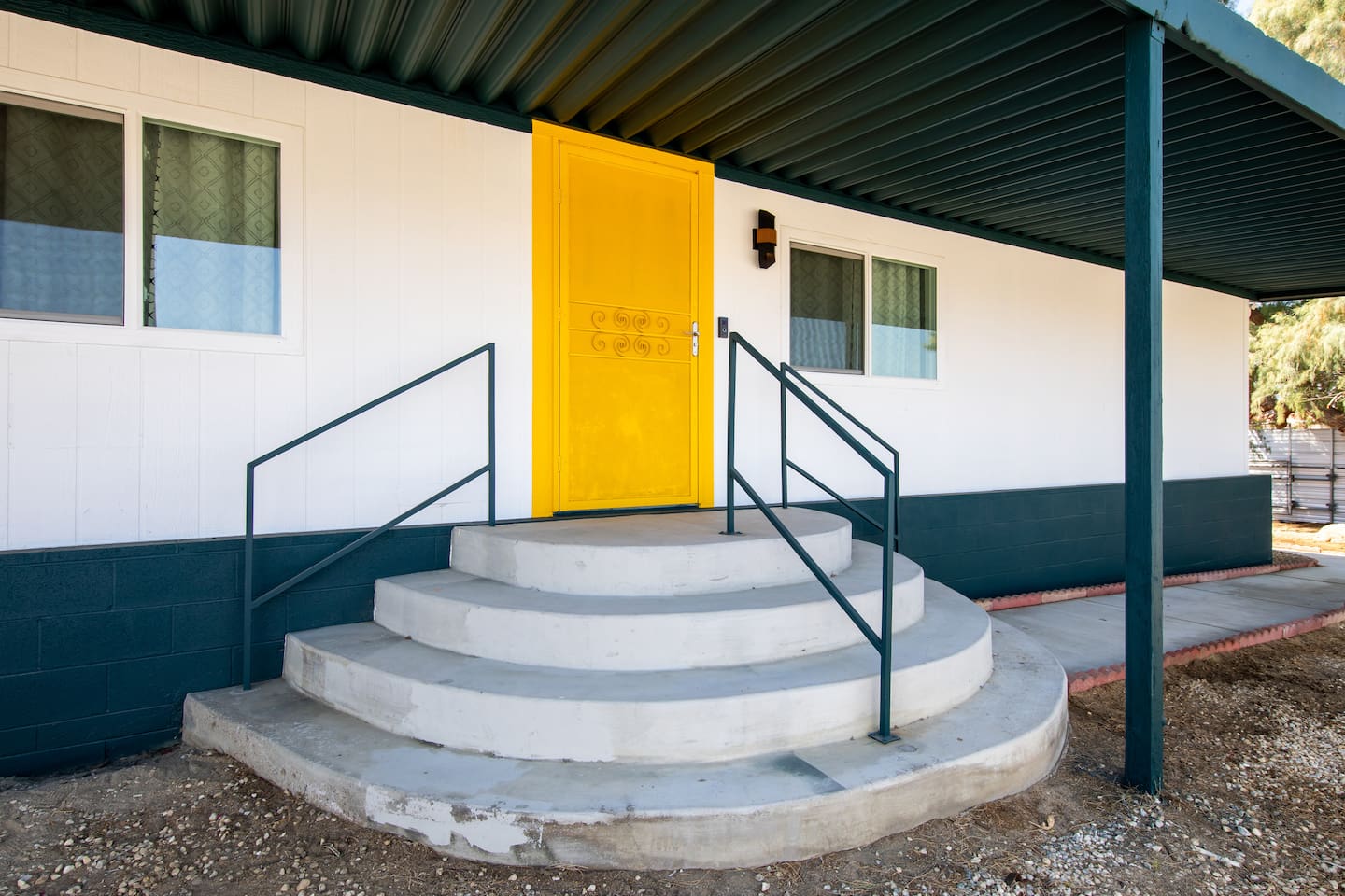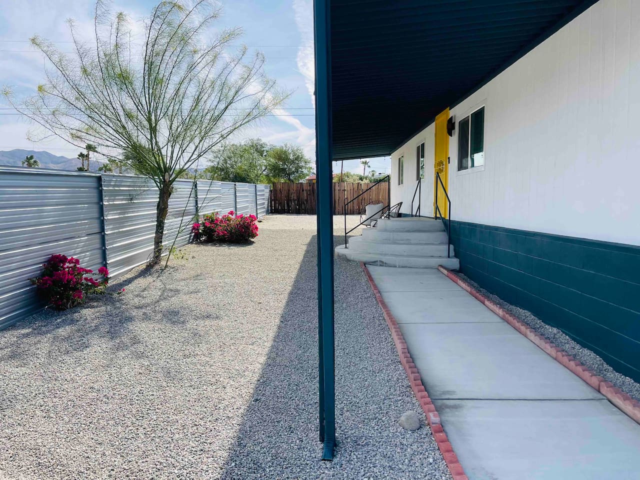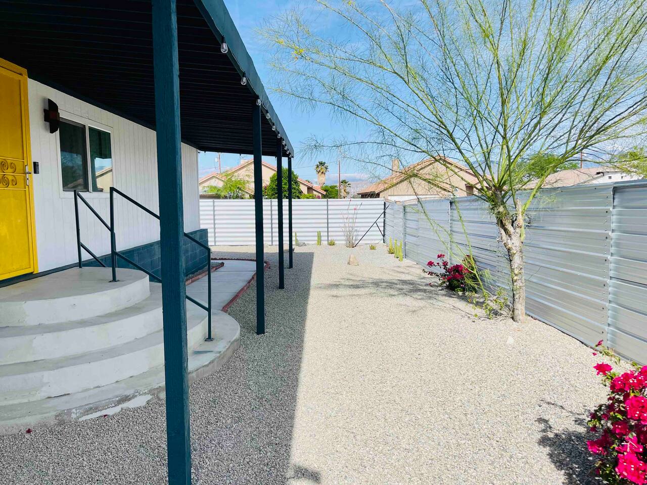 Located in modest and busy neighborhood of Desert Hot Springs. It's a lively street with residential neighbors. House is located within 15 minutes walk to the Lautner compound Merely 11 mins to Highway 10 and 17 mins drive to Palm Springs. 18 mins drive to Costco in Palm Desert. 2 drive mins to The Sands Golf Course.