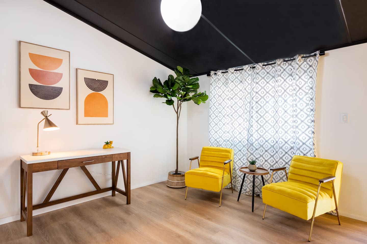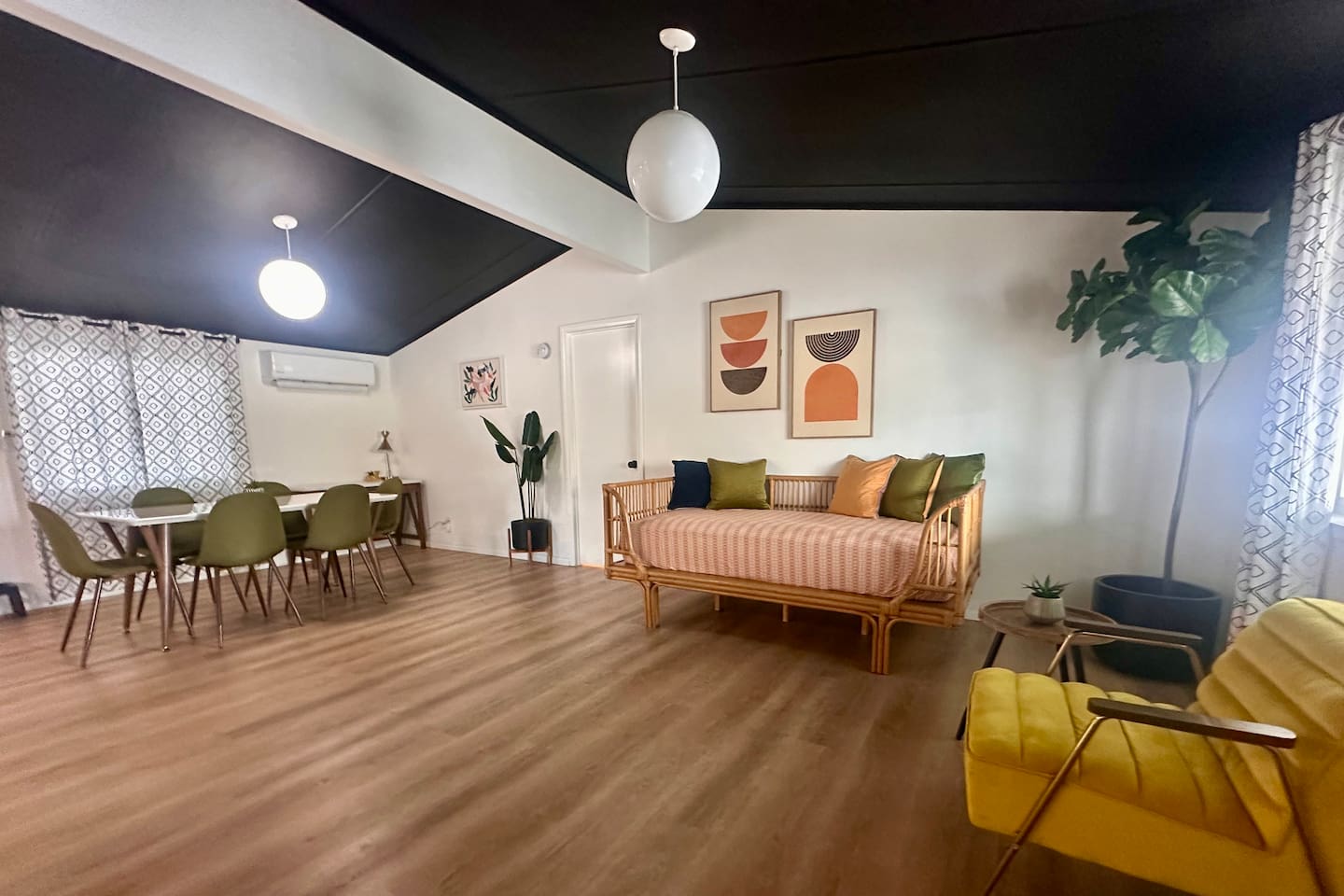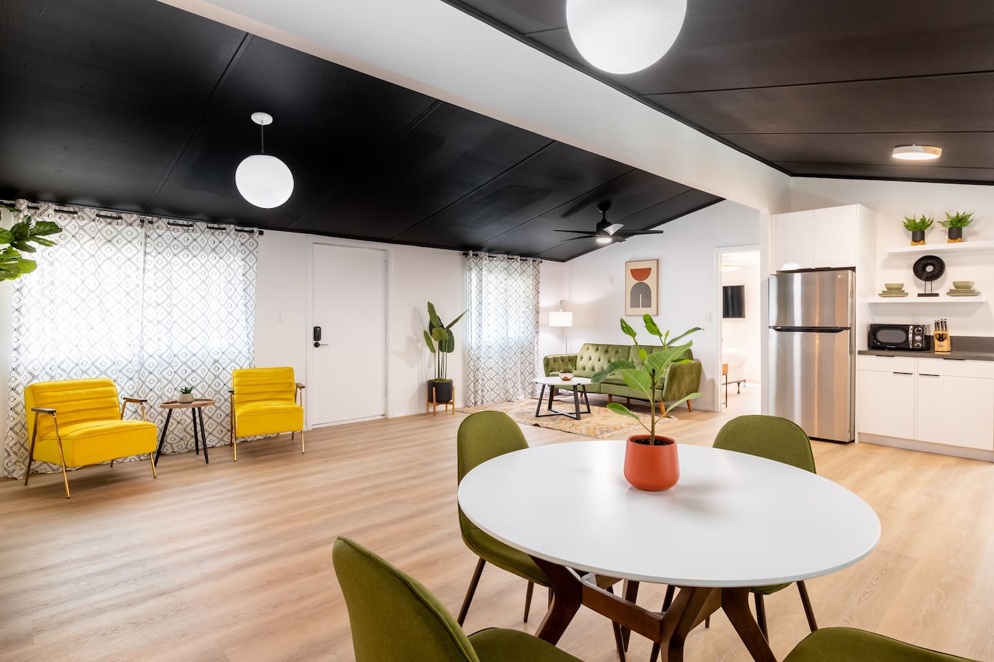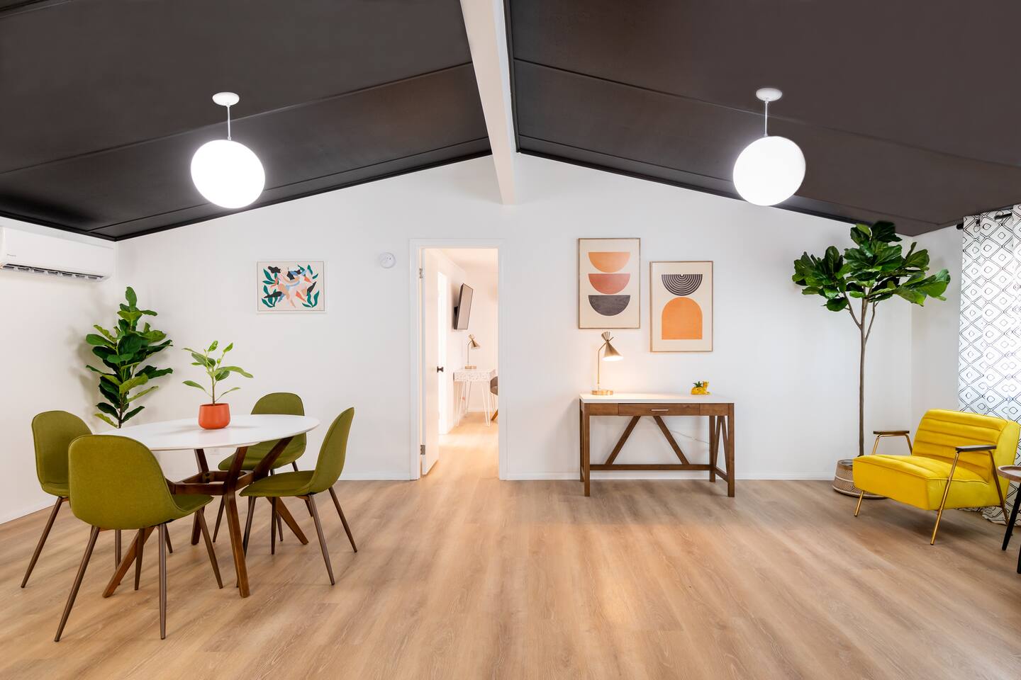 Located in modest and busy neighborhood of Desert Hot Springs. It's a lively street with residential neighbors. House is located within 15 minutes walk to the Lautner compound Merely 11 mins to Highway 10 and 17 mins drive to Palm Springs. 18 mins drive to Costco in Palm Desert. 2 drive mins to The Sands Golf Course.