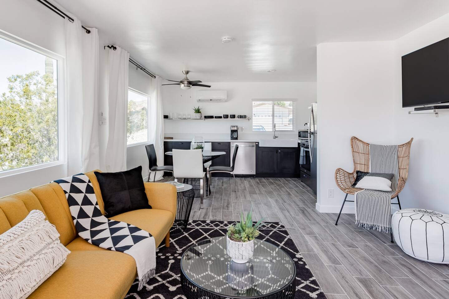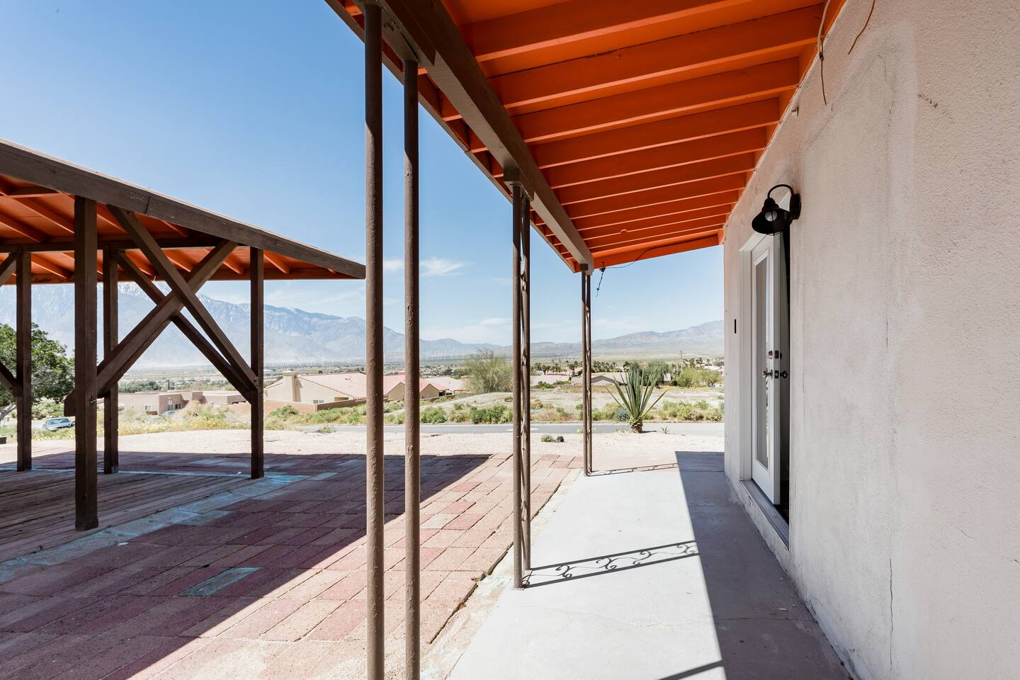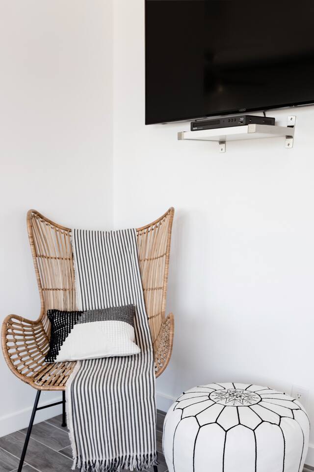 This apartment offers a modern, cool retreat in the desert with a convenient location. Perfect for those wishing to visit the beautiful desert locale but still remain close to local conveniences, such as grocery stores, drug stores, and restaurants. Great for a romantic getaway for couples or convenient accommodation for small groups! Hotel level amenities such as 24/7 front desk staff to call should you need anything during your stay. Our space is professionally cleaned by hotel-trained housekeepers and features 100% cotton hotel quality linens, freshly laundered for a good night’s sleep! Includes pool access (not onsite). Mount San Jacinto can be seen in full view right from the living room of this one totally renovated bedroom apartment. Master bedroom has a king sized bed. The kitchen features brand new stainless steel full size appliances. It is well stocked with dishes, cookware, and basic cooking essentials such as oil, salt, pepper, spice rack, and coffee + tea. Two 50 inch flat-screen TVs that can be used to stream video content. Free Parking for one vehicle in the driveway. Plenty of easy street parking.