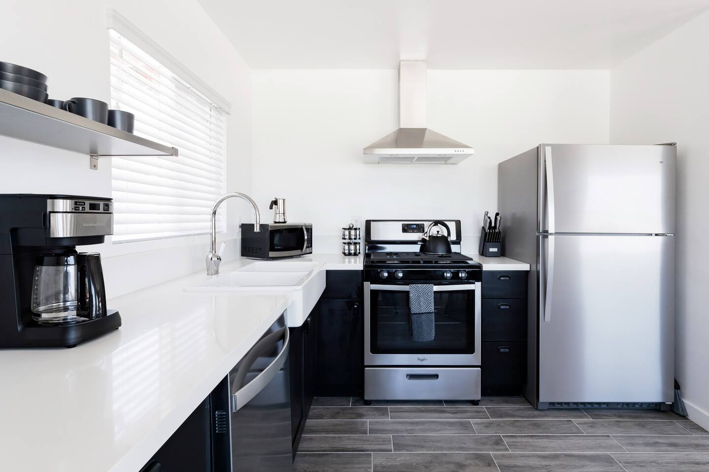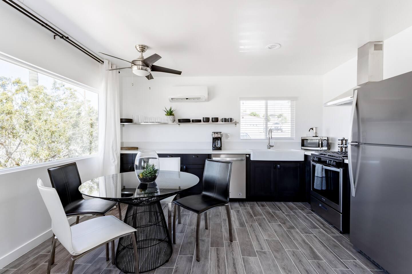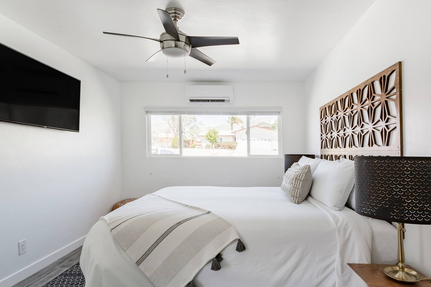 This apartment offers a modern, cool retreat in the desert with a convenient location. Perfect for those wishing to visit the beautiful desert locale but still remain close to local conveniences, such as grocery stores, drug stores, and restaurants. Great for a romantic getaway for couples or convenient accommodation for small groups! Hotel level amenities such as 24/7 front desk staff to call should you need anything during your stay. Our space is professionally cleaned by hotel-trained housekeepers and features 100% cotton hotel quality linens, freshly laundered for a good night’s sleep! Includes pool access (not onsite). Mount San Jacinto can be seen in full view right from the living room of this one totally renovated bedroom apartment. Master bedroom has a king sized bed. The kitchen features brand new stainless steel full size appliances. It is well stocked with dishes, cookware, and basic cooking essentials such as oil, salt, pepper, spice rack, and coffee + tea. Two 50 inch flat-screen TVs that can be used to stream video content. Free Parking for one vehicle in the driveway. Plenty of easy street parking.