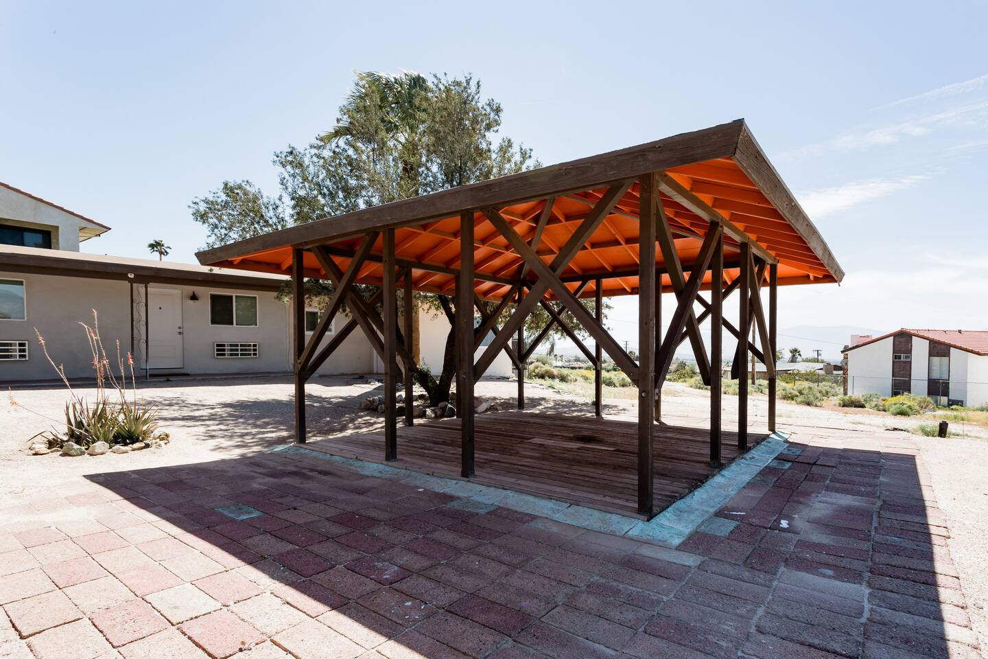Located in Desert Hot Springs, the apartment is set on slightly raised land boasting panoramic vistas of the San Jacinto Mountains. Grocery stores, restaurants, and stores are a short drive away. The entrance to Joshua Tree is 45 minutes away by car. Although not as fancy as its neighboring Palm Springs, it is visited by hundreds of tourist daily for its renowned abundance of natural mineral spring water.