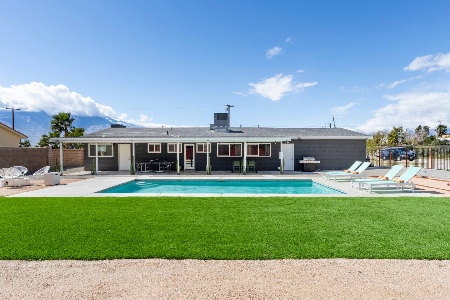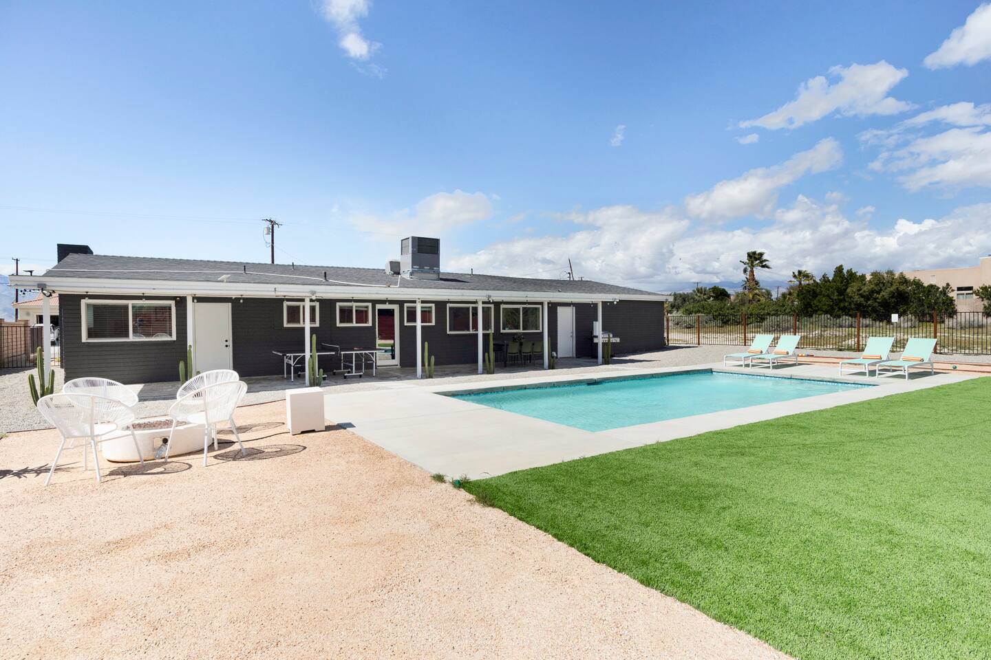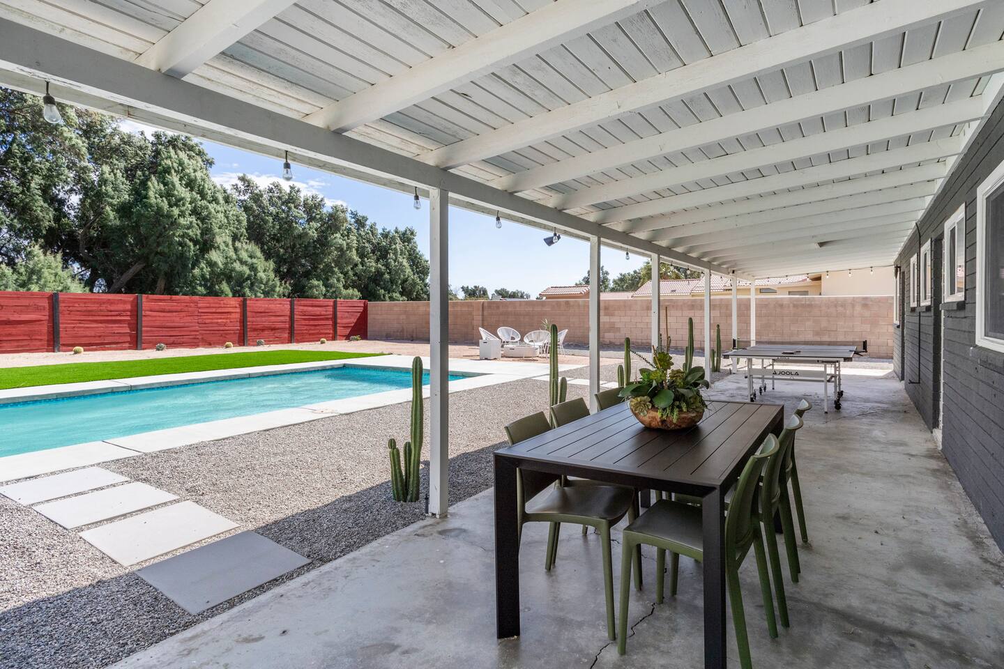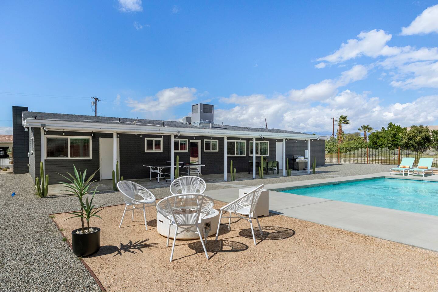 Licensed with Riverside County Permit# 000822 Fully landscaped backyard with swimming pool, bbq, and ping pong table perfect to enjoy those warm desert nights. Our home features a brand-new kitchen with all new stainless-steel appliances and gorgeous glass tile back splash. The same theme follows to all three bathrooms as they share the same green glass tile design. Original brick walls and cement floors were kept bringing out the true essence of the home. One bedroom has a King-sized bed and a full bathroom with shower. The middle unit can be used as a lounge or if needed can sleep three person in triple twin beds. The 3rd bedroom also has two queen beds a private bathroom with shower. Living room has futon sleeper. There is an additional half restroom in the hallway. --Pet Policy-- We allow up to 2 dogs in unit. Upon departure, clean up dog hair to the best of your ability. The cost of additional cleaning or laundering services due to excessive dog hair will be billed to the guest. Promptly bag and dispose of all dog waste from the yard during your stay and at time of departure. Dogs are not allowed on furniture or beds. Bring your dog’s favorite blanket or bed. Bring a pet crate and use whenever you must leave your dog unattended for a period of time. Never leave your dog unattended if it barks or chews when left alone