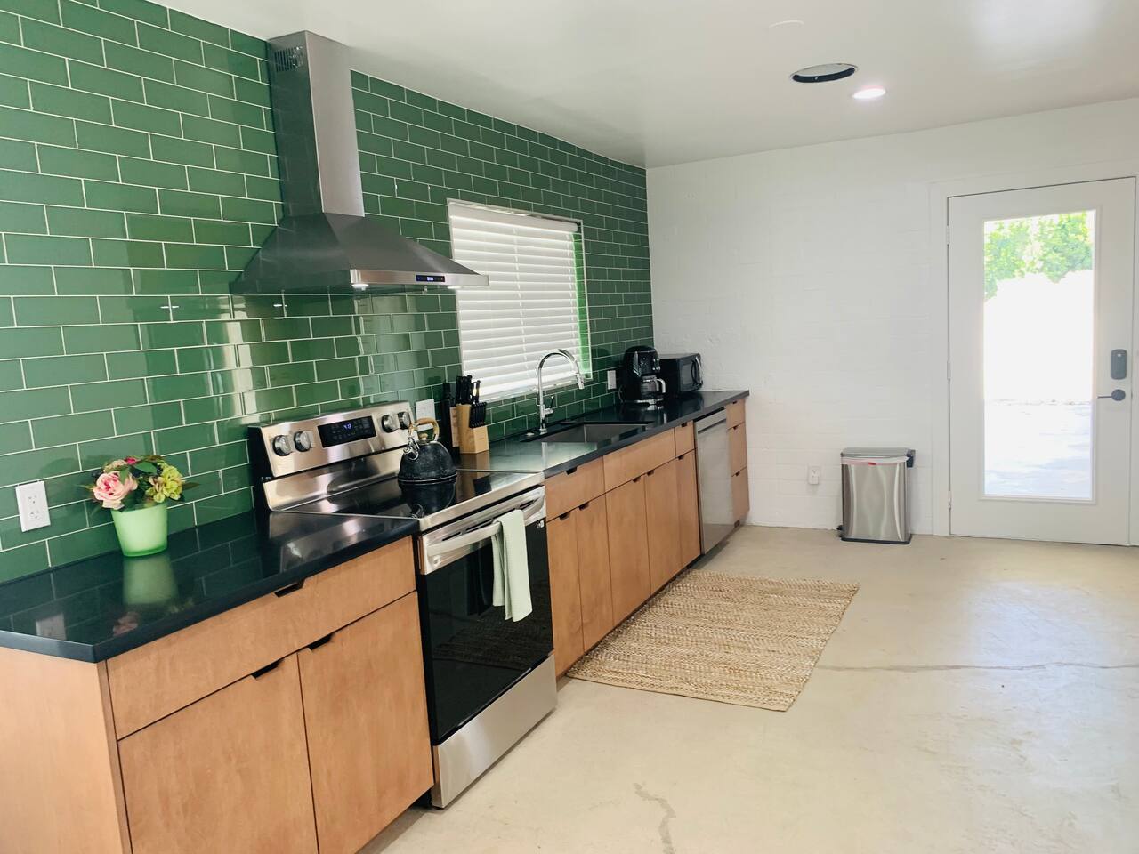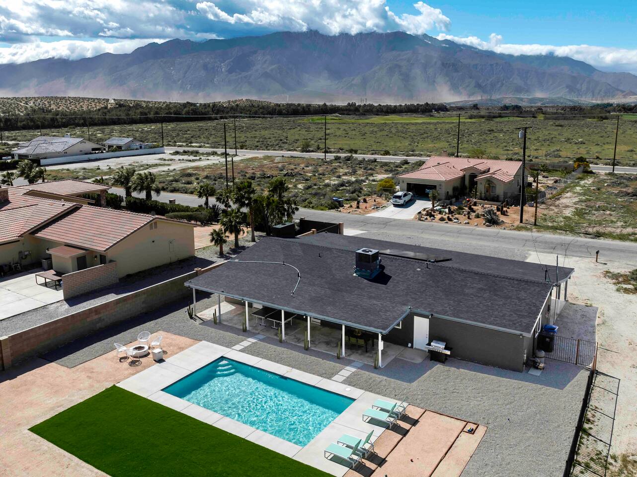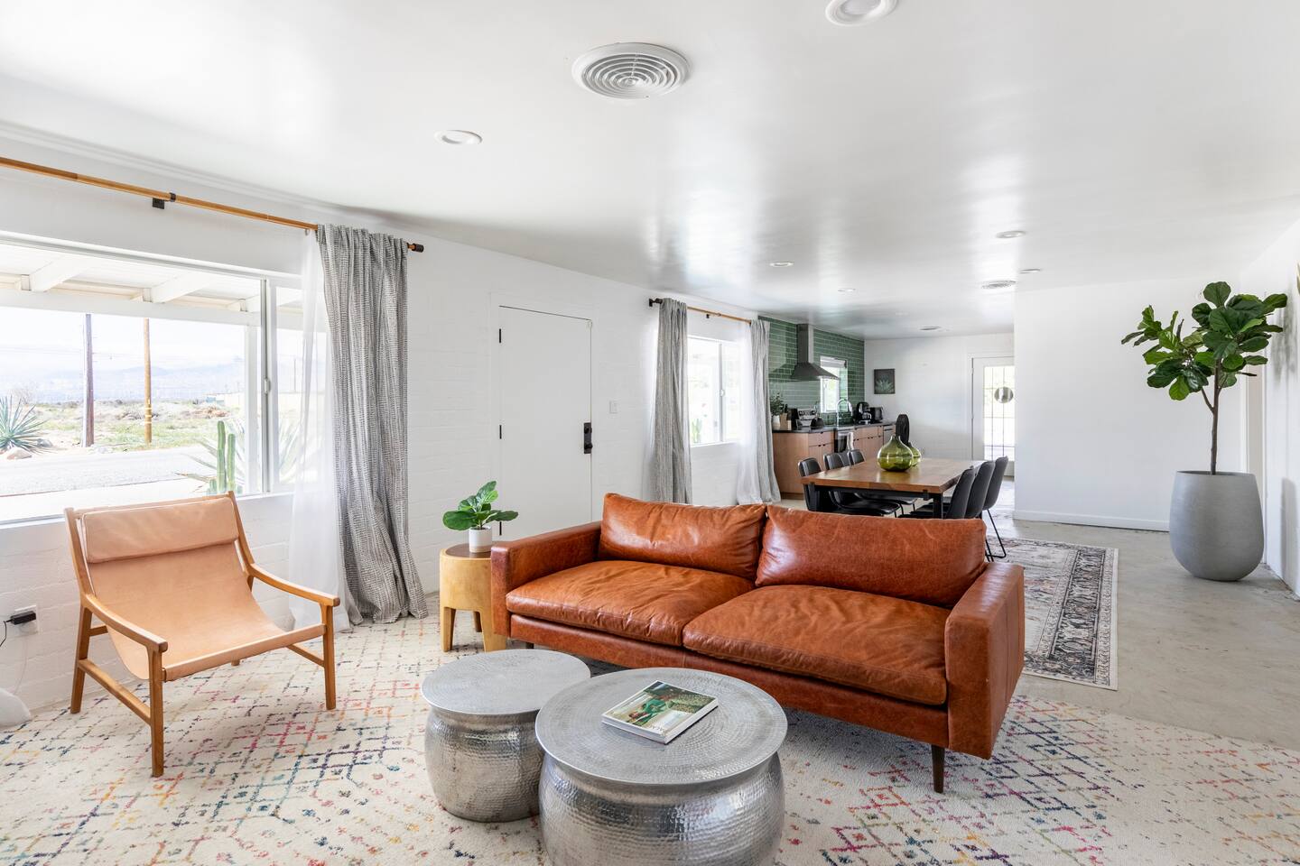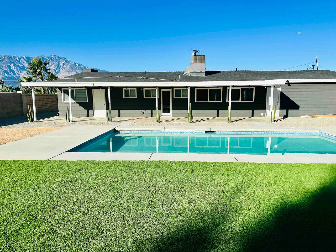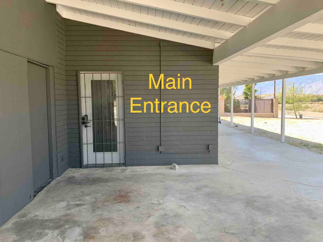 Licensed with Riverside County Permit# 000822 Fully landscaped backyard with swimming pool, bbq, and ping pong table perfect to enjoy those warm desert nights. Our home features a brand-new kitchen with all new stainless-steel appliances and gorgeous glass tile back splash. The same theme follows to all three bathrooms as they share the same green glass tile design. Original brick walls and cement floors were kept bringing out the true essence of the home. One bedroom has a King-sized bed and a full bathroom with shower. The middle unit can be used as a lounge or if needed can sleep three person in triple twin beds. The 3rd bedroom also has two queen beds a private bathroom with shower. Living room has futon sleeper. There is an additional half restroom in the hallway. --Pet Policy-- We allow up to 2 dogs in unit. Upon departure, clean up dog hair to the best of your ability. The cost of additional cleaning or laundering services due to excessive dog hair will be billed to the guest. Promptly bag and dispose of all dog waste from the yard during your stay and at time of departure. Dogs are not allowed on furniture or beds. Bring your dog’s favorite blanket or bed. Bring a pet crate and use whenever you must leave your dog unattended for a period of time. Never leave your dog unattended if it barks or chews when left alone