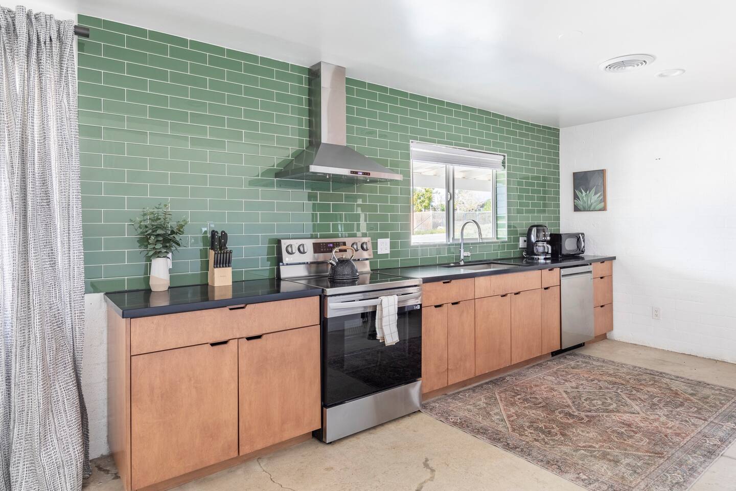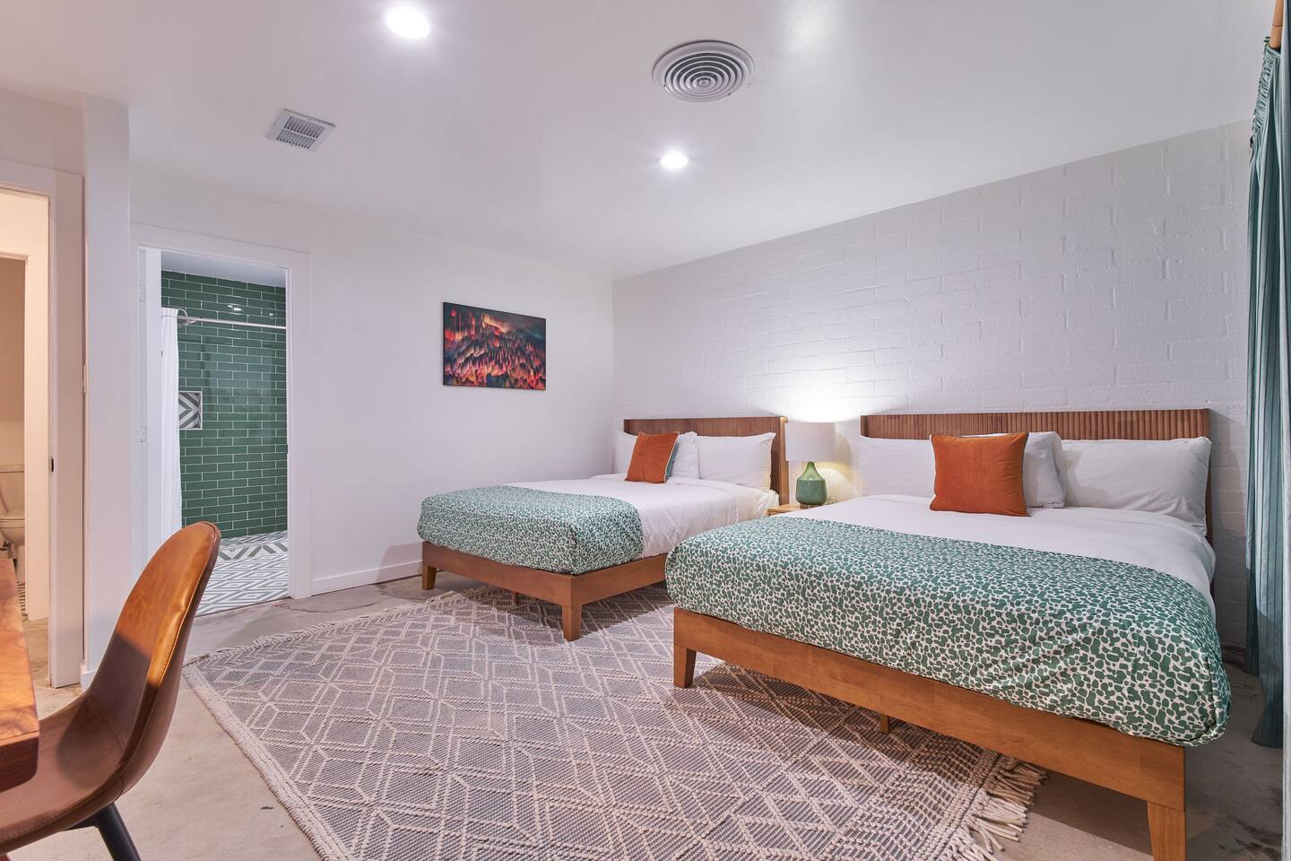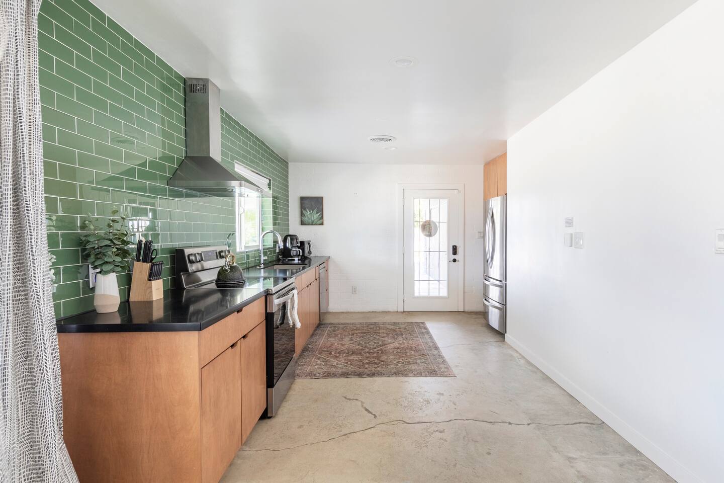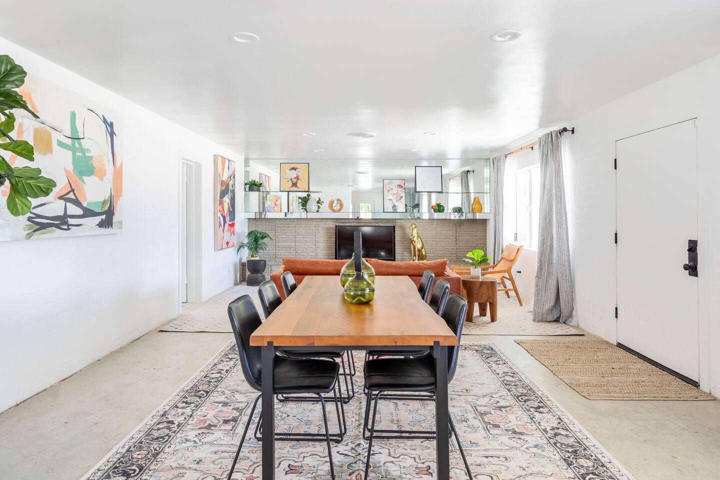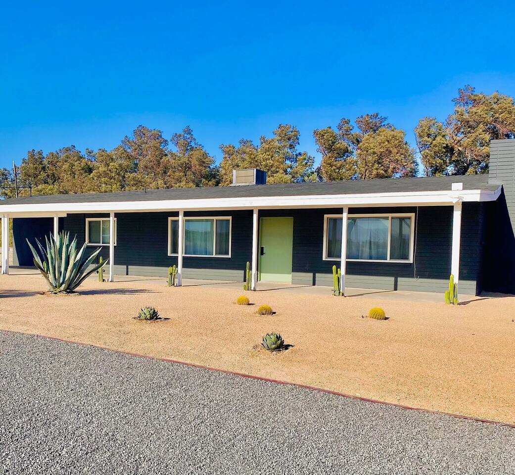 Licensed with Riverside County Permit# 000822 Fully landscaped backyard with swimming pool, bbq, and ping pong table perfect to enjoy those warm desert nights. Our home features a brand-new kitchen with all new stainless-steel appliances and gorgeous glass tile back splash. The same theme follows to all three bathrooms as they share the same green glass tile design. Original brick walls and cement floors were kept bringing out the true essence of the home. One bedroom has a King-sized bed and a full bathroom with shower. The middle unit can be used as a lounge or if needed can sleep three person in triple twin beds. The 3rd bedroom also has two queen beds a private bathroom with shower. Living room has futon sleeper. There is an additional half restroom in the hallway. --Pet Policy-- We allow up to 2 dogs in unit. Upon departure, clean up dog hair to the best of your ability. The cost of additional cleaning or laundering services due to excessive dog hair will be billed to the guest. Promptly bag and dispose of all dog waste from the yard during your stay and at time of departure. Dogs are not allowed on furniture or beds. Bring your dog’s favorite blanket or bed. Bring a pet crate and use whenever you must leave your dog unattended for a period of time. Never leave your dog unattended if it barks or chews when left alone