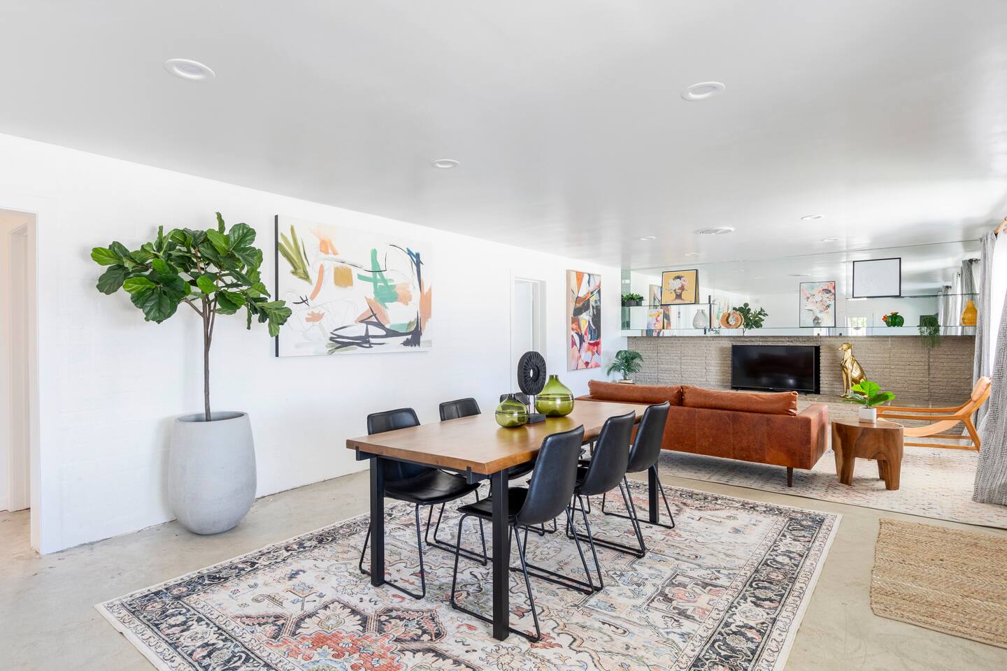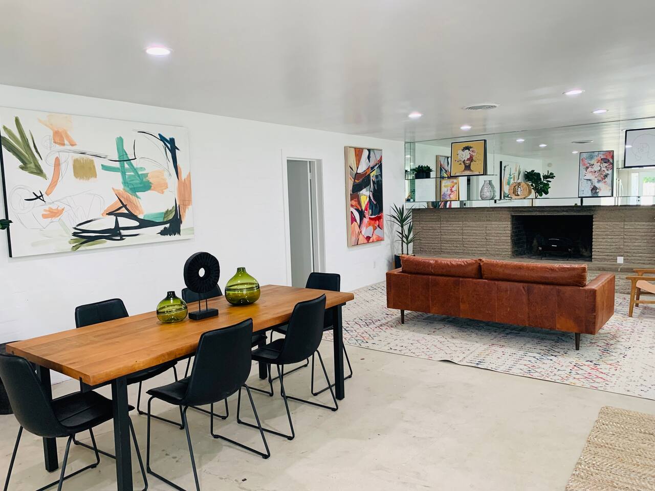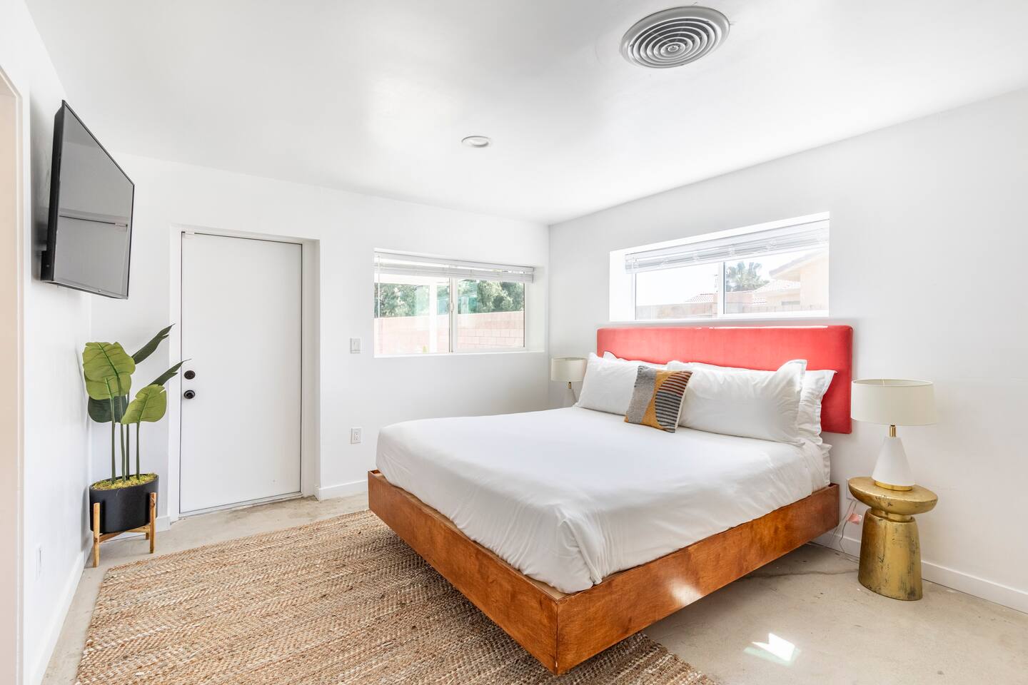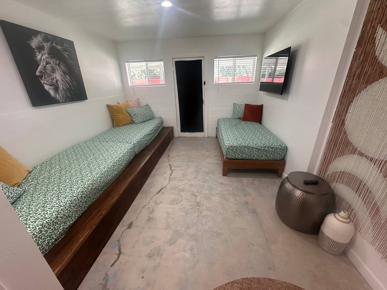Licensed with Riverside County Permit# 000822 Fully landscaped backyard with swimming pool, bbq, and ping pong table perfect to enjoy those warm desert nights. Our home features a brand-new kitchen with all new stainless-steel appliances and gorgeous glass tile back splash. The same theme follows to all three bathrooms as they share the same green glass tile design. Original brick walls and cement floors were kept bringing out the true essence of the home. One bedroom has a King-sized bed and a full bathroom with shower. The middle unit can be used as a lounge or if needed can sleep three person in triple twin beds. The 3rd bedroom also has two queen beds a private bathroom with shower. Living room has futon sleeper. There is an additional half restroom in the hallway. --Pet Policy-- We allow up to 2 dogs in unit. Upon departure, clean up dog hair to the best of your ability. The cost of additional cleaning or laundering services due to excessive dog hair will be billed to the guest. Promptly bag and dispose of all dog waste from the yard during your stay and at time of departure. Dogs are not allowed on furniture or beds. Bring your dog’s favorite blanket or bed. Bring a pet crate and use whenever you must leave your dog unattended for a period of time. Never leave your dog unattended if it barks or chews when left alone