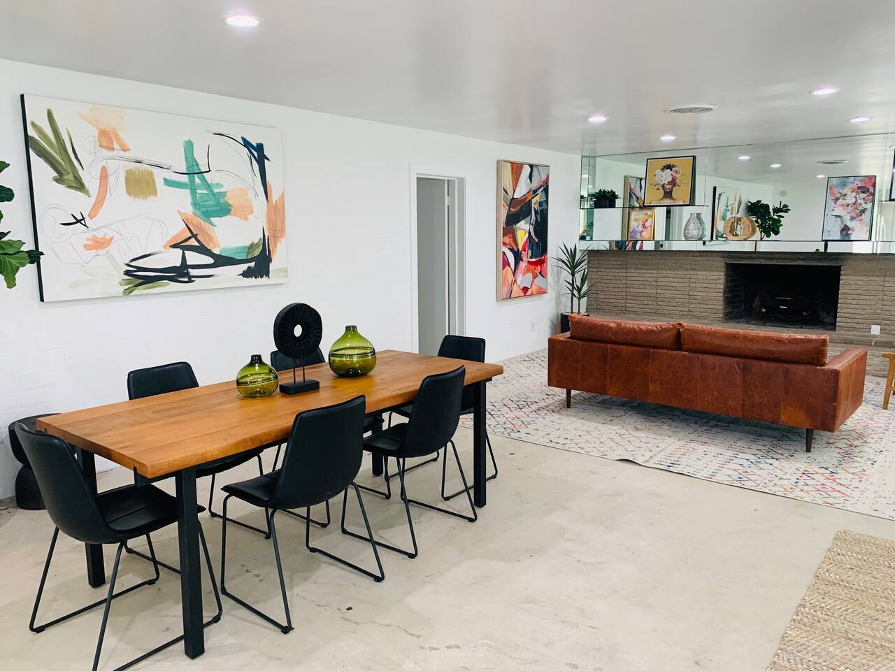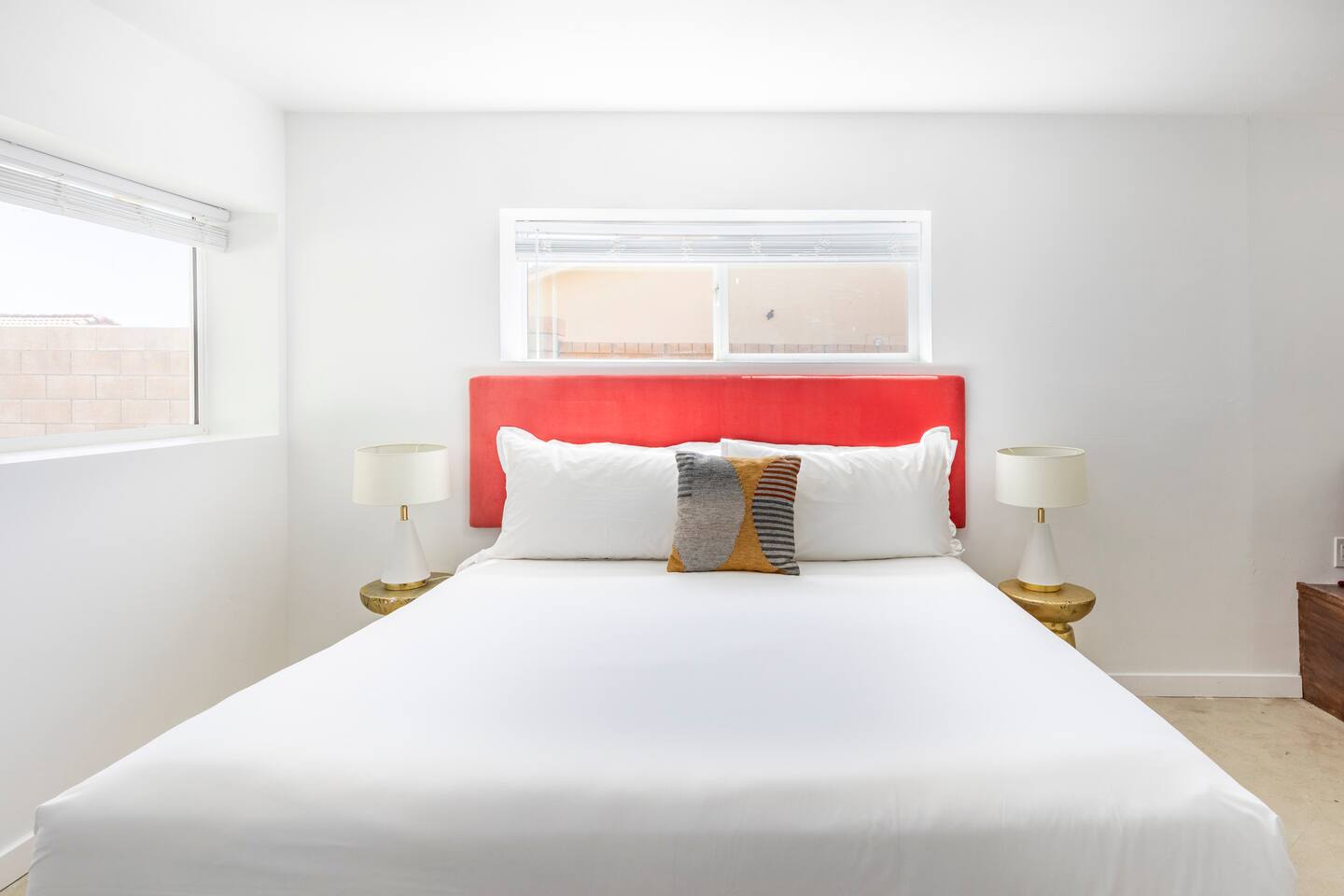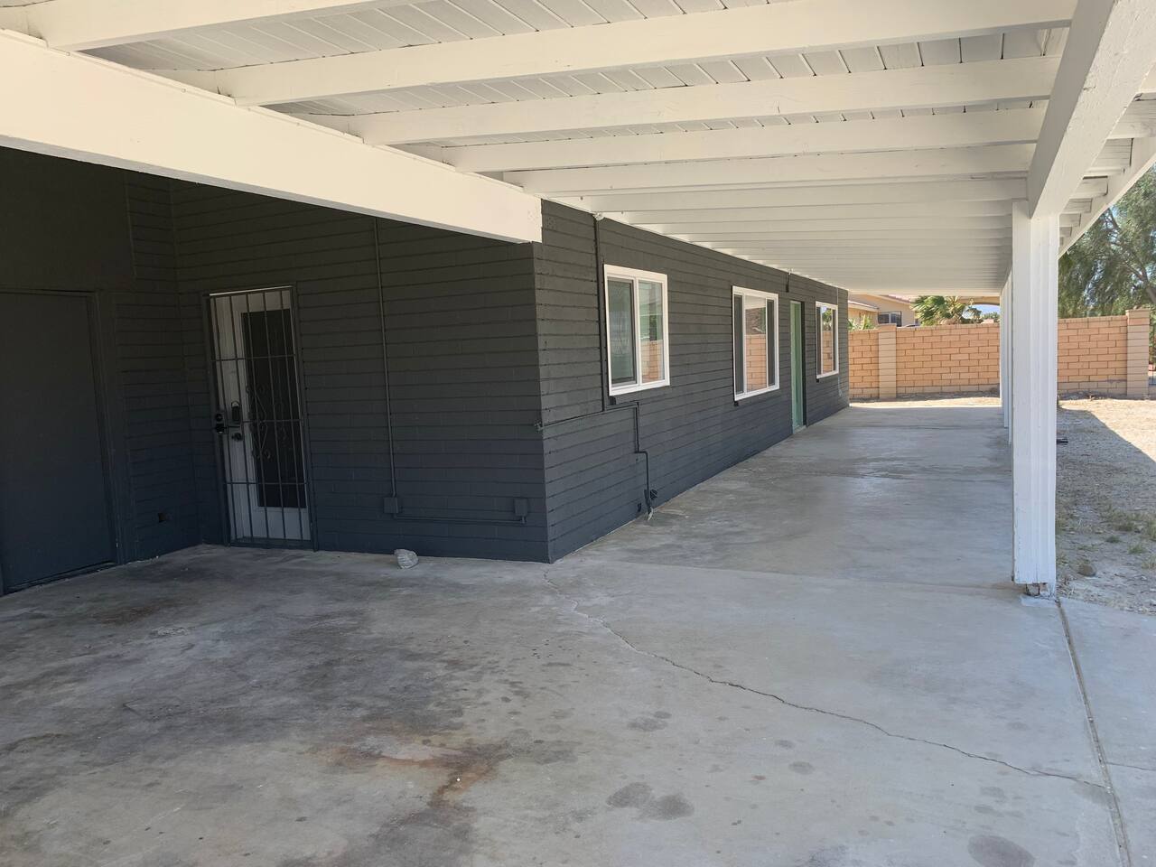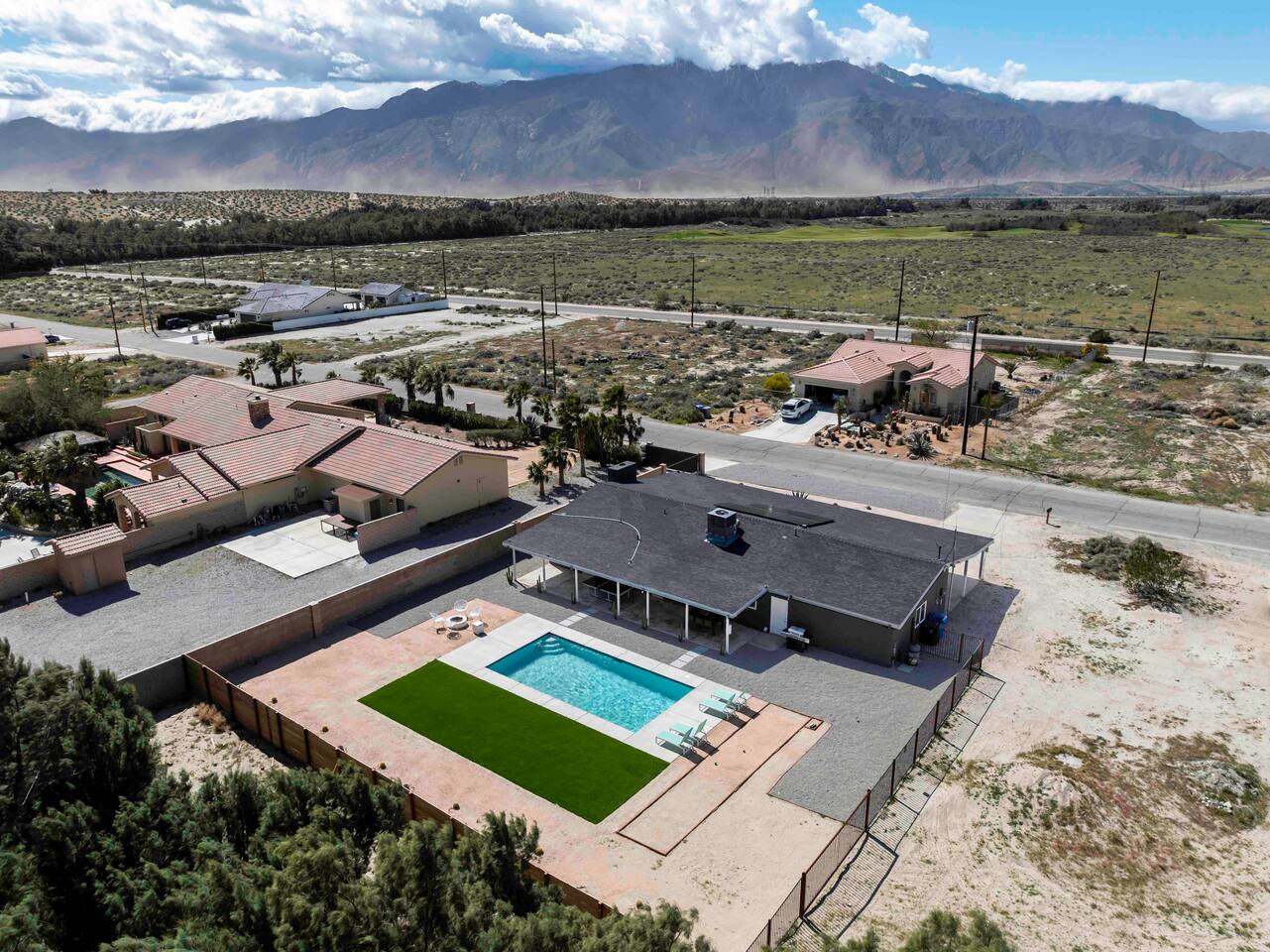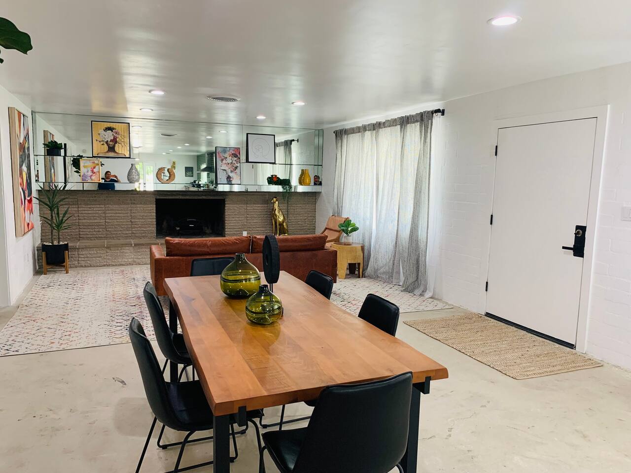 Licensed with Riverside County Permit# 000822 Fully landscaped backyard with swimming pool, bbq, and ping pong table perfect to enjoy those warm desert nights. Our home features a brand-new kitchen with all new stainless-steel appliances and gorgeous glass tile back splash. The same theme follows to all three bathrooms as they share the same green glass tile design. Original brick walls and cement floors were kept bringing out the true essence of the home. One bedroom has a King-sized bed and a full bathroom with shower. The middle unit can be used as a lounge or if needed can sleep three person in triple twin beds. The 3rd bedroom also has two queen beds a private bathroom with shower. Living room has futon sleeper. There is an additional half restroom in the hallway. --Pet Policy-- We allow up to 2 dogs in unit. Upon departure, clean up dog hair to the best of your ability. The cost of additional cleaning or laundering services due to excessive dog hair will be billed to the guest. Promptly bag and dispose of all dog waste from the yard during your stay and at time of departure. Dogs are not allowed on furniture or beds. Bring your dog’s favorite blanket or bed. Bring a pet crate and use whenever you must leave your dog unattended for a period of time. Never leave your dog unattended if it barks or chews when left alone