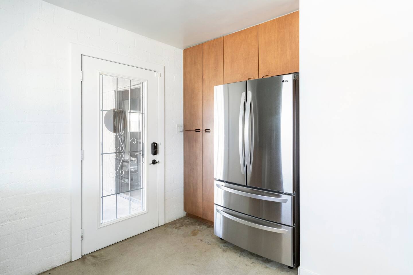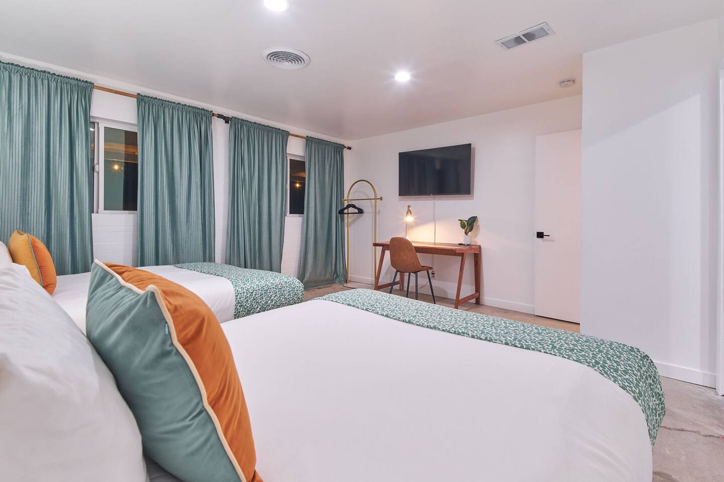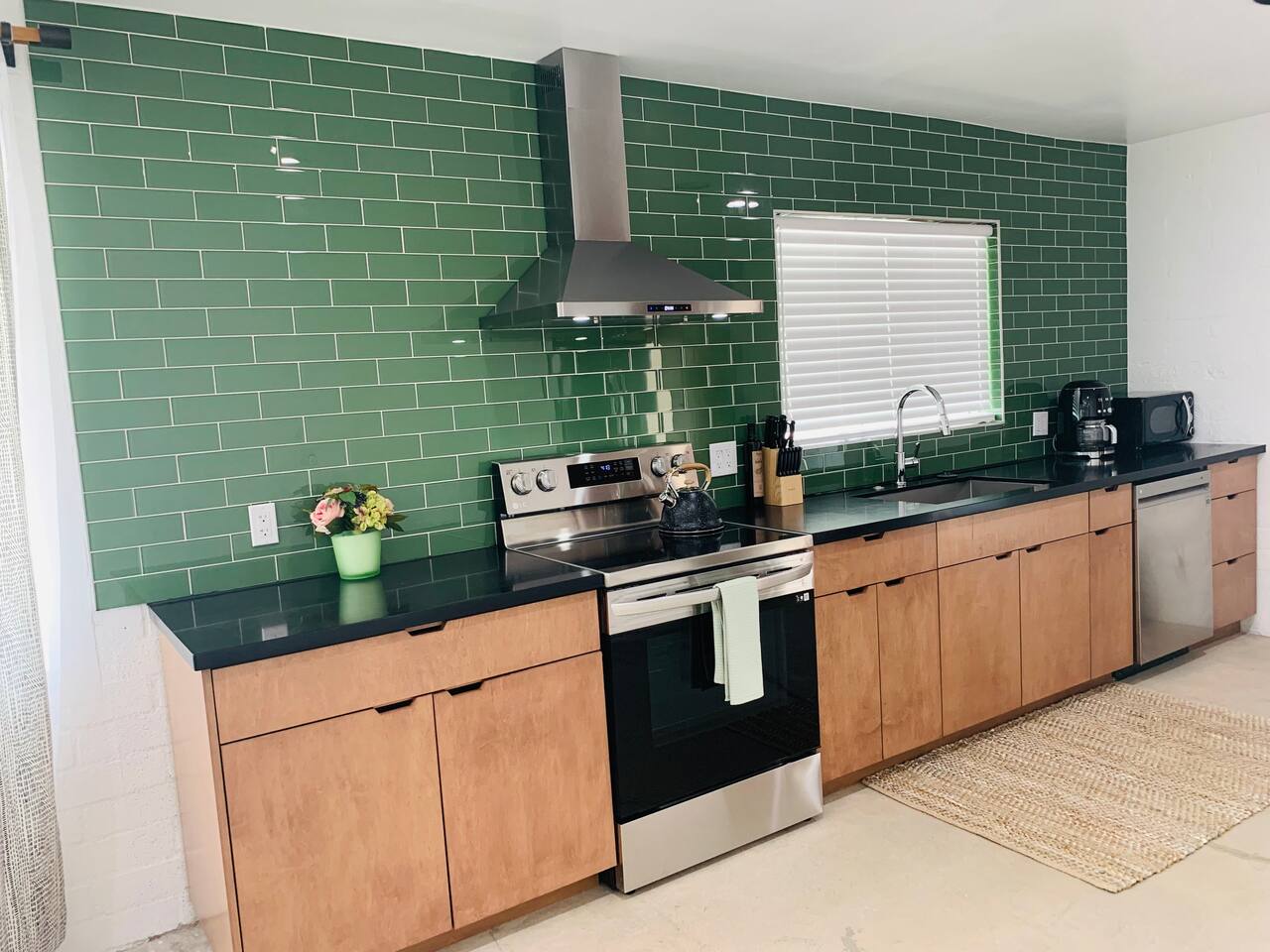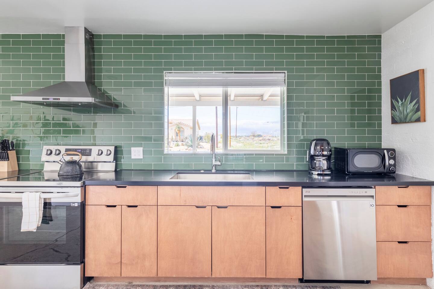 Licensed with Riverside County Permit# 000822 Fully landscaped backyard with swimming pool, bbq, and ping pong table perfect to enjoy those warm desert nights. Our home features a brand-new kitchen with all new stainless-steel appliances and gorgeous glass tile back splash. The same theme follows to all three bathrooms as they share the same green glass tile design. Original brick walls and cement floors were kept bringing out the true essence of the home. One bedroom has a King-sized bed and a full bathroom with shower. The middle unit can be used as a lounge or if needed can sleep three person in triple twin beds. The 3rd bedroom also has two queen beds a private bathroom with shower. Living room has futon sleeper. There is an additional half restroom in the hallway. --Pet Policy-- We allow up to 2 dogs in unit. Upon departure, clean up dog hair to the best of your ability. The cost of additional cleaning or laundering services due to excessive dog hair will be billed to the guest. Promptly bag and dispose of all dog waste from the yard during your stay and at time of departure. Dogs are not allowed on furniture or beds. Bring your dog’s favorite blanket or bed. Bring a pet crate and use whenever you must leave your dog unattended for a period of time. Never leave your dog unattended if it barks or chews when left alone