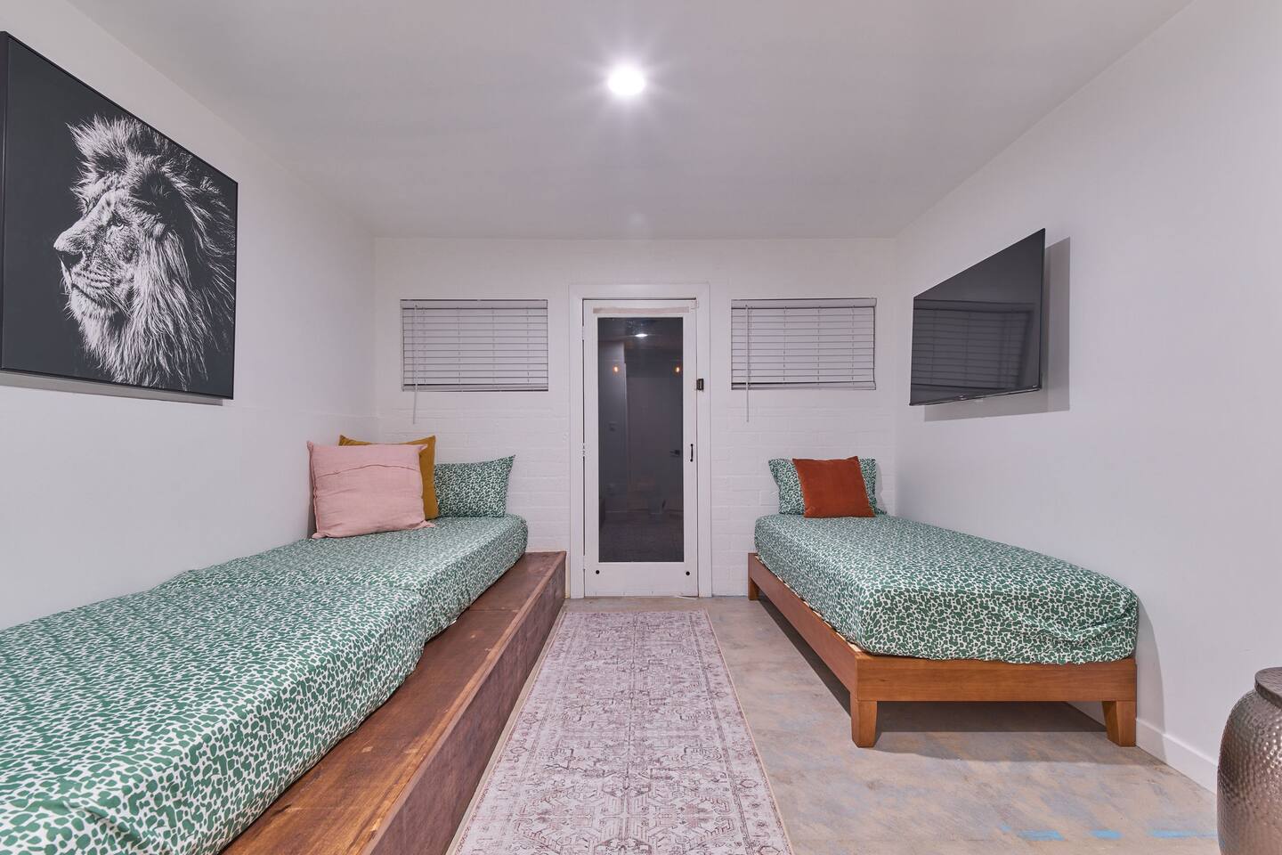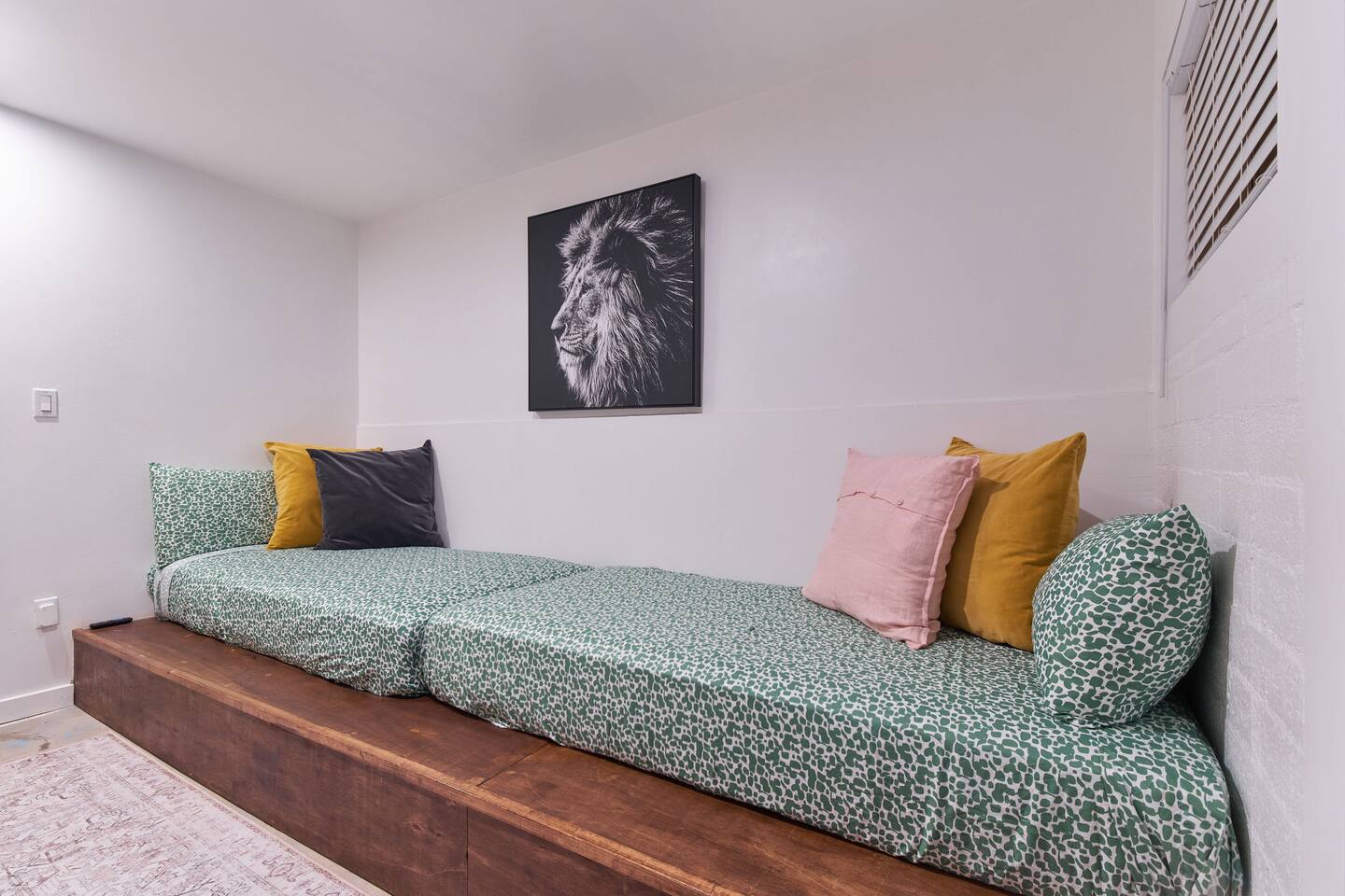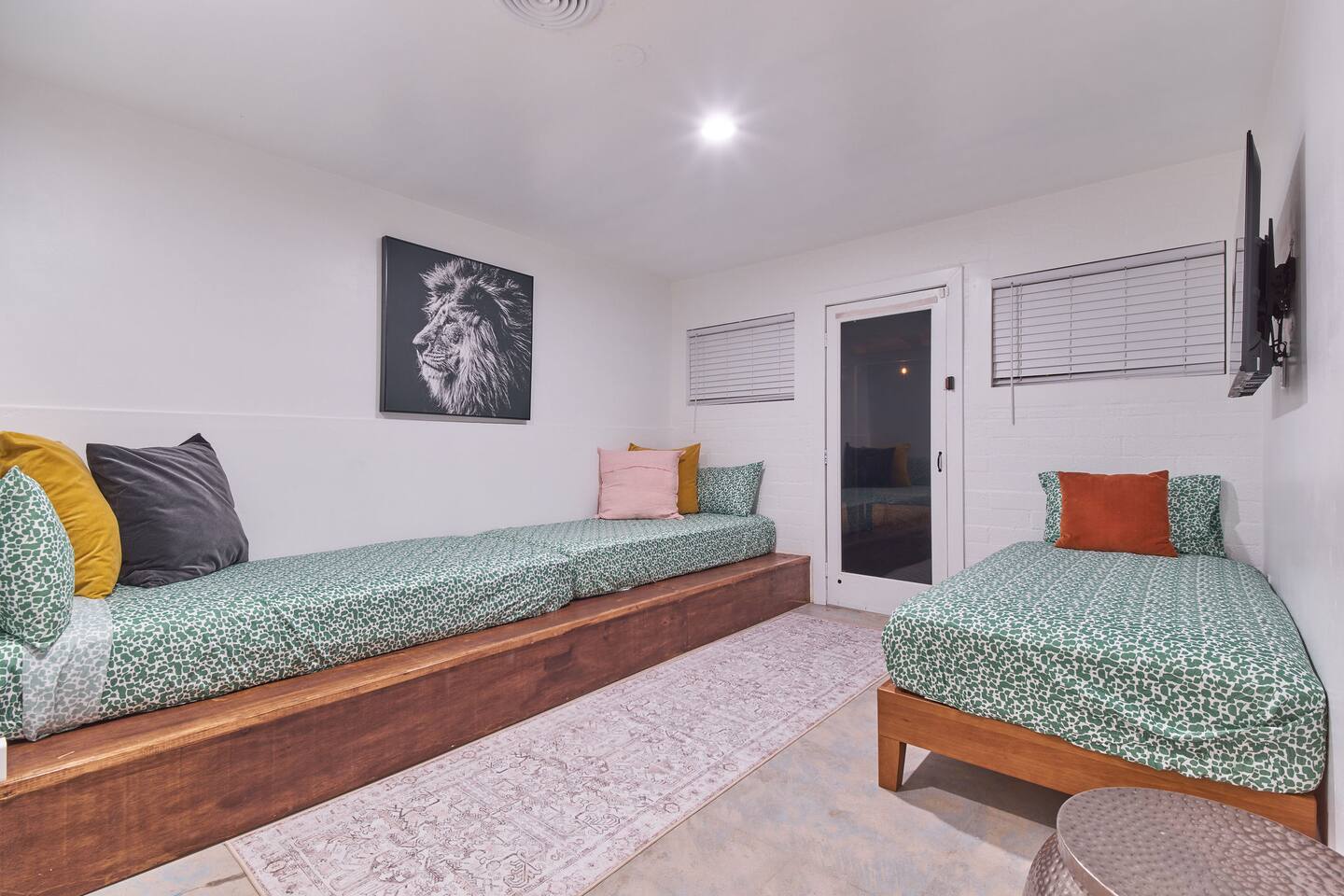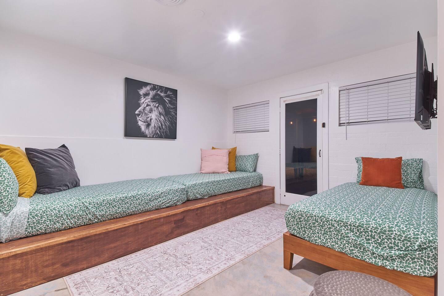 Bring the whole family to this great place with lots of room for fun. Backyard has swimming pool, BBQ, and ping pong table & bocce ball court. Original brick walls, cement floors & tasteful designer interiors work amazing well with its impressive glass tile kitchen and baths. 1 king, 2 queens, 3 twin mattress, 1 futon sofa, sleeps 10 comfortably.